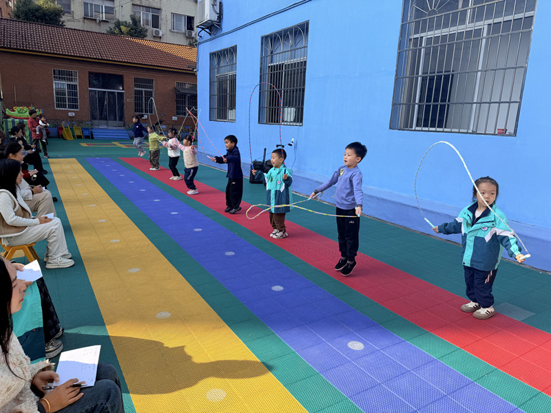 跳绳项目更是精彩绝伦,大班幼儿挥动跳绳,双脚轻盈跳跃,身影在绳间灵活穿梭。有的小朋友节奏稳健、耐力十足,有的虽偶有失误却迅速调整,绝不轻言放弃。场边老师和同伴们的加油声、欢呼声此起彼伏,成为小运动员们最坚实的后盾。