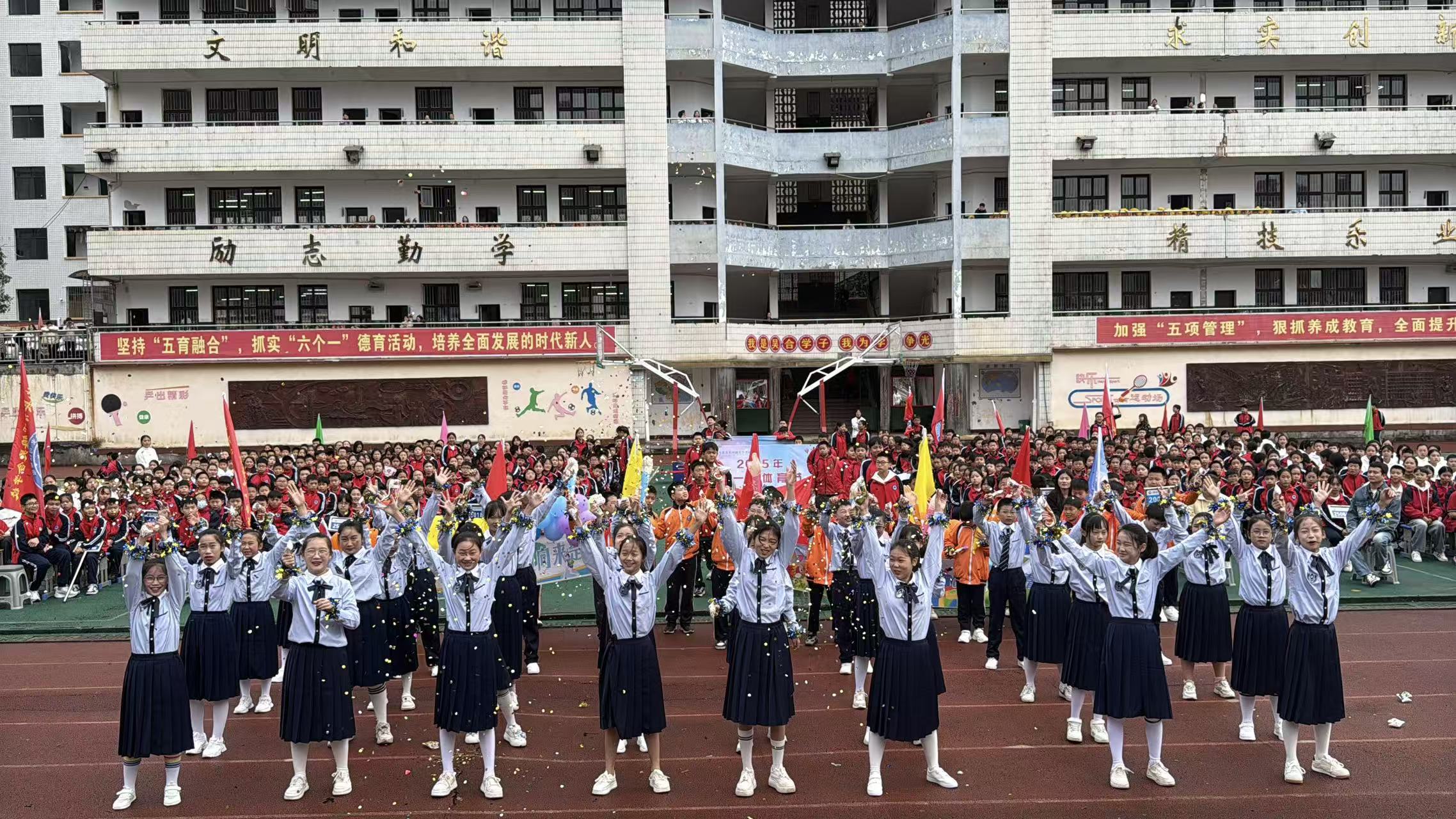 本网讯 11月4日,东坪镇吴合学校举行了第一届体育节开幕式,首届体育节在庄严的国歌声中正式拉开帷幕。 开幕式上,国旗方阵、彩旗方阵、班级方阵及裁判员方阵依次入场,步伐铿锵、口号嘹亮。由学生代表组成的国旗方阵庄严肃穆,五星红旗在晨光中冉冉升起。30个班级方阵以创意十足的表演惊艳亮相:有的班级身着传统汉服、有的班级手持创意道具、更有班级以舞蹈、武术等形式传递青春激情。裁判员代表谌俊主任庄严宣誓:“我们将严格遵守竞赛规则,公平公正执裁,确保赛事顺利进行。”该校初中部校长周云在开幕式上致辞,他对吴合学校首届体育节的举办表示热烈祝贺,并勉励师生以体育节为契机,将拼搏精神融入学习与生活,为实现个人梦想与推动学校发展贡献力量。随后,党支部书记兼校长林群丰宣布体育节正式开幕。 开幕式尾声,初中部2501班表演的室内操《以梦为马少年行》将气氛推向高潮。学生们以整齐划一的动作、富有创意的编排,充分展现吴合学子团结协作、积极向上的精神风貌。据悉,本届体育节为期四天,涵盖田径、球类、趣味运动等比赛项目,后续精彩对决值得期待。 初审初校:邓娴琳 复审复校:周云 终审终校:林群丰