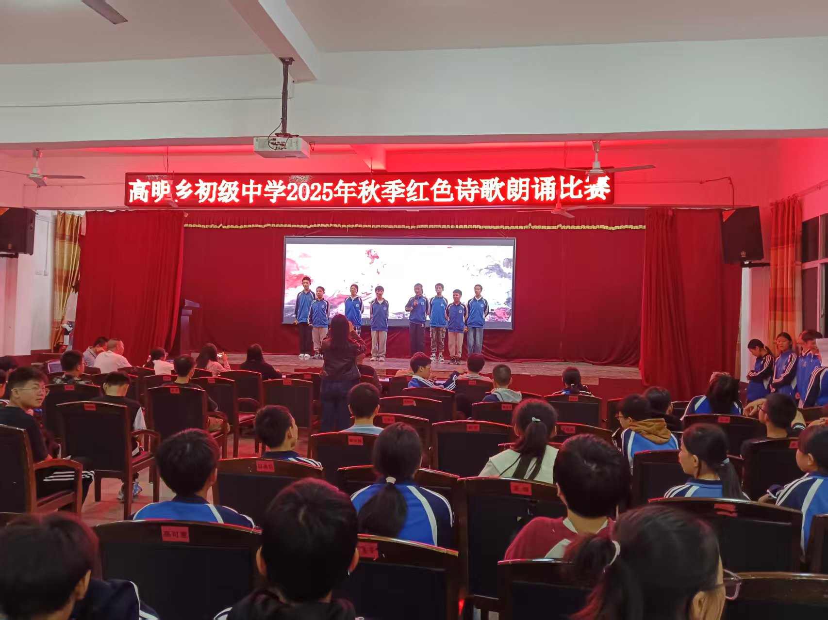 本网讯 9月22日晚,为传承红色基因,弘扬爱国主义精神,提高诗词朗诵水平,以“声韵绕梁间,诗词咏新篇”为主题的红色诗歌朗诵比赛在高明乡初级中学大礼堂举办。 本次比赛,经过班级初赛后,共有12个小组荣登今晚的赛台。比赛现场,气氛热烈而庄重,各小组以真挚的情感、激昂的语调,演绎着一篇篇经典红色作品。评委组从主题内容、情感传递、创意表现、语言表达、台风形象五个方面,严肃认真地对照评分细则评判计分。经过两个多小时紧张激烈的角逐,飞跃组的《我站立的地方是中国》荣获特等奖,阳光组的《这盛世如你所愿》和少翼组的《新时代,新青年》摘得一等奖,奋斗组等四个组夺得二等奖,向阳组等五个组取得三等奖。 比赛总结时,学校德育负责人刘小蝶评价道:“此次红色诗歌朗诵比赛,不仅丰富了我们的校园文化生活,提升了同学们的朗诵水平和语言表达能力,更让红色文化在校园中生根发芽,激发了同学们的爱国热情和民族自信心。” (通讯员 高飞跃) 初审初校:高飞跃 复审复校:高广华 终审终校:高尚轩