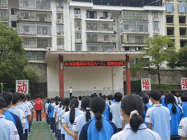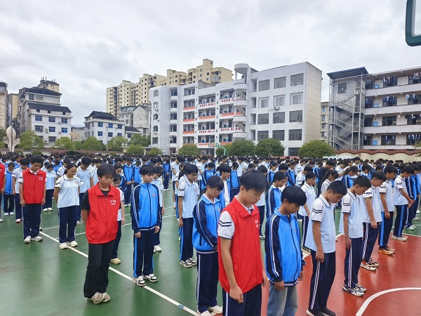 本网讯 9月18日上午,平口镇中学组织全体师生肃立操场举行“勿忘九一八,吾辈当自强”默哀活动。 活动在庄严肃穆的氛围中拉开序幕。国旗下,学生代表夏嘉怡带领师生回望“九一八”事变的民族苦难历程,深情讲述先烈抗争故事,呼吁全体同学铭记历史教训,肩负时代使命,以奋发图强告慰先辈。上午10时整,防空警报准时划破长空,全体师生即刻垂首肃立,在三分钟的静默中,向抗战中牺牲的英烈与遇难同胞致以最深切的哀思。现场寂静无声,哀思与敬意交织,凝聚成砥砺前行的强大精神力量。