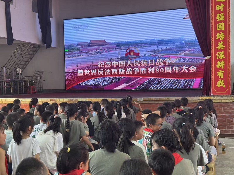 本网讯 9月3日,梅城镇东华完小全体师生齐聚学校礼堂,集中观看中国人民抗日战争胜利暨世界反法西斯战争胜利80周年阅兵式直播,以沉浸式教育厚植爱国情怀。作为益阳市唯一一所“八一爱民学校”、安化县唯一一所“国家国防教育示范学校”,该校始终将红色基因传承与国防教育融入日常教学,此次活动正是其特色育人模式的生动实践。 9时许,礼堂内座无虚席,师生们身着整齐校服,目光专注地注视着大屏幕。当威武的受阅方队踏着正步走过天安门广场,当“向右看”的口号响彻云霄,全场爆发出阵阵热烈掌声。五年级学生李梓萌感叹道:“我仿佛看到了先烈们当年浴血奋战的身影,我们今天的幸福生活来之不易!” 作为“八一爱民学校”,该校长期与益阳军分区开展共建活动,定期组织“国防知识讲座”等特色课程;作为“国家国防教育示范学校”,学校还将抗战历史、国防知识纳入校本课程,通过红色故事宣讲、军事技能体验等活动,让国防教育“活”起来。 “作为两所‘唯一’荣誉加身的学校,我们更要肩负起立德树人的使命。”该校负责人表示,此次活动不仅是一次爱国主义教育,更是对学校国防教育成果的检验。 初审初校:冷美婷 复审复校:曹欣昕 终审终校:高 飞