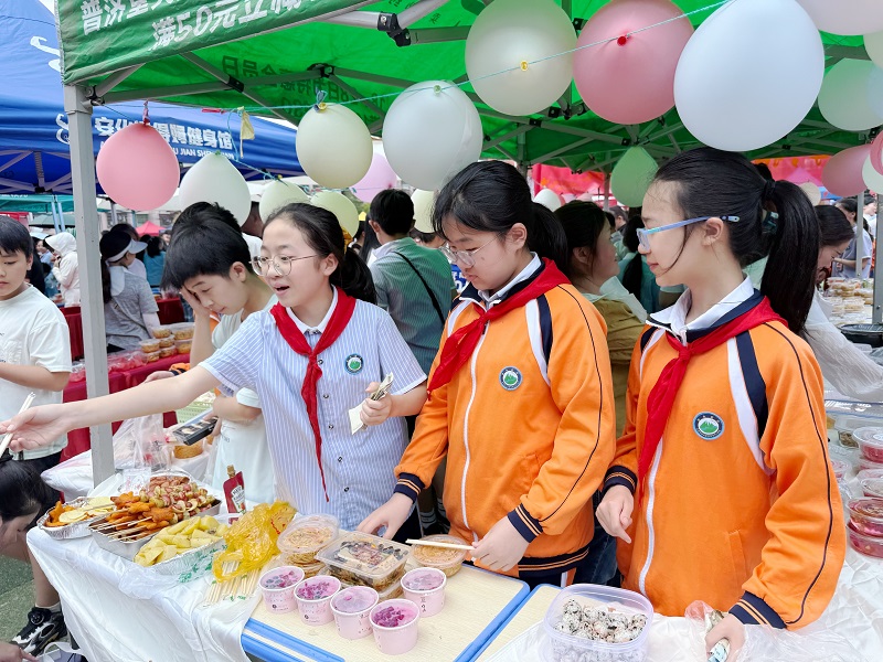 美食节环节热闹非凡,学校操场瞬间变身“美食乐园”。四至六年级学生踊跃参与“六一味蕾狂欢,舌尖绽放热爱”美食节活动。孩子们自己动手制作美食、参与售卖,在实践中学习劳动技能和理财知识。活动现场秩序井然,欢声笑语不断。