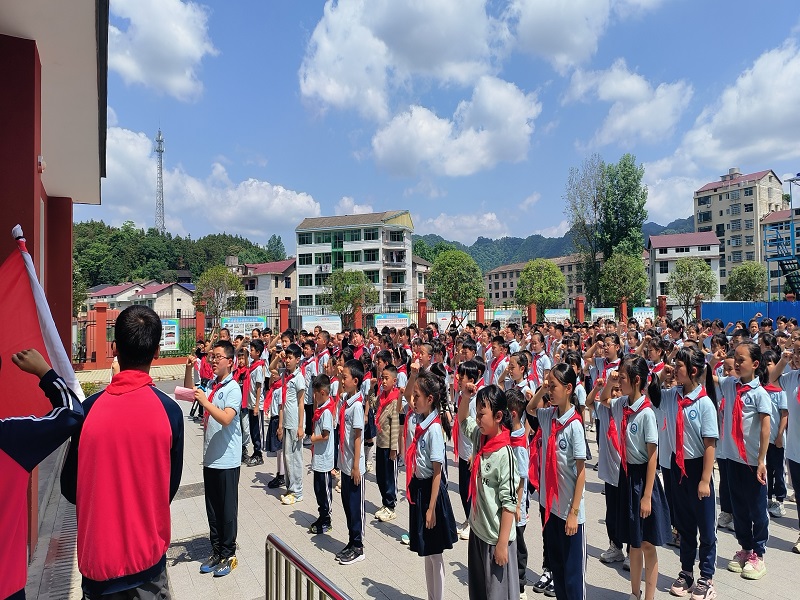 在激昂的《出旗曲》中,少先队旗手迈着整齐的步伐入场,全体师生高唱《中国少年先锋队队歌》。大队辅导员宣读新队员名单后,老队员代表为新队员佩戴红领巾。新队员们挺直身躯,右手握拳庄严宣誓:“准备着,为共产主义事业而奋斗!”稚嫩而坚定的声音响彻校园。 校领导在仪式中深情寄语,强调红领巾“是红旗的一角,是责任与使命的象征”,勉励新队员“以队礼致敬信仰,以行动践行誓言”,争做德智体美劳全面发展的新时代好队员。