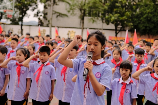 本网讯 5月29日,梅城镇紫云完小举行中国少年先锋队2025年新队员入队仪式,161名学生光荣加入少先队组织。 仪式在庄严的国歌声中拉开序幕。伴随着激昂的出旗曲,旗手护卫队旗入场,全体少先队员齐声高唱《中国少年先锋队队歌》。随后,老队员为新队员佩戴上鲜艳的红领巾。新队员们面向队旗,高举右拳,庄严宣誓。稚嫩而坚定的誓言,铿锵有力,回荡在校园上空,表达了他们坚定的决心与承诺。 校长李兴家寄语新队员,勉励他们珍惜荣誉、勤奋学习、传承红色基因,努力争做新时代好队员。新队员代表冯逸之在发言中表达了加入少先队的自豪感,承诺用实际行动为班级和学校增光添彩。 仪式上,大队辅导员龙欣为新建的一年级47、48、49中队授中队旗。李兴家校长为新任大队辅导员颁发聘书。政教主任贺小琴宣布了优秀少先队员名单并颁奖。最后,全体少先队员在队旗下进行庄严呼号,仪式在退旗曲中圆满落幕。