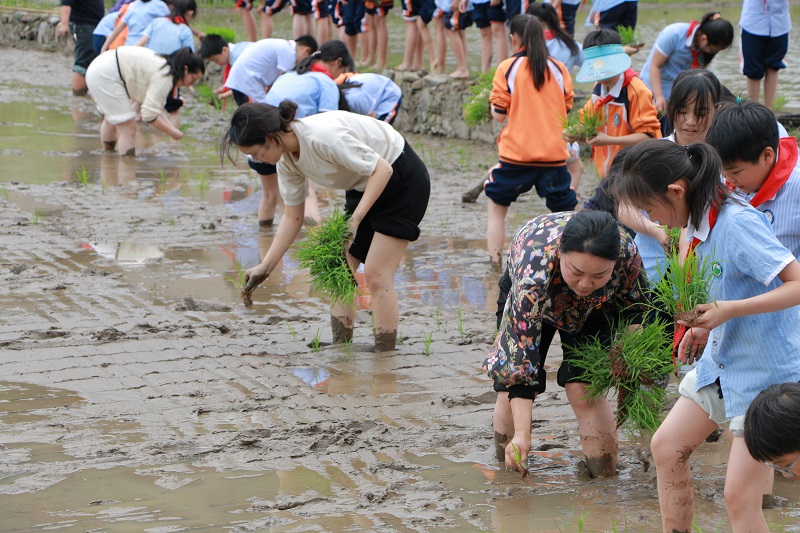 本网讯 4月30日,马路镇完小五年级学生代表和教师代表走进农耕体验基地,开展插秧种植劳动课程。 老师和同学们满怀期待地来到活动现场。活动前,同学们认真聆听了工会主席王光群、总务主任邓东永讲解水稻种植知识、插秧技巧及注意事项。同学们在回归乡野感知大自然的同时也懂得了尊重每一株小秧苗。 接着,在老师的指导下,同学们挽起裤脚、光着脚丫,下到水田中学习分苗、插秧的技巧。“秧苗要直,间距要匀”,“根要扎稳,别让水冲走”……尽管动作生疏,但他们神情专注,一次次弯腰、插种,泥水溅湿衣裤也毫不在意。许多同学感慨:“原来插秧这么累!农民伯伯真不容易!” 半个小时过去了,一个小时过去了……看着一片片嫩绿的秧苗整齐地挺立在田间,同学们真切感悟到一分耕耘,一分收获的喜悦。返程路上,大家虽满身泥水,却兴致盎然,争相分享感受:“回家后一定不再浪费粮食!”“劳动虽然累,但看到自己插的秧苗特别自豪!” 初审初校:邓洁 复审复校:邓翠玲 终审终校:龚燕