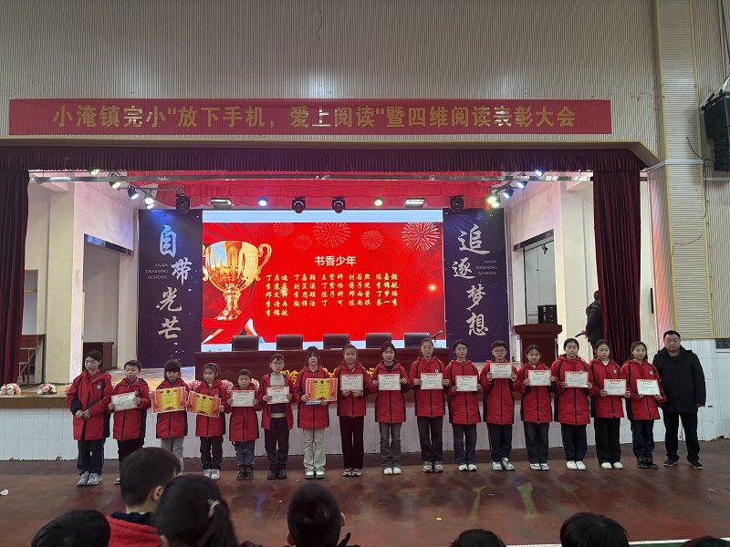 本网讯 3月13日,小淹镇完小成功举办“放下手机,爱上阅读”暨四维阅读颁奖活动,3—6年级师生汇聚学校风雨球场,共同见证这一阅读盛事。 活动开场,该校支部书记、校长陶武军进行阅读推广发言。他强调阅读是同学们获取知识、开阔视野的重要途径,鼓励大家远离手机,多与好书相伴,在阅读中不断充实自我。