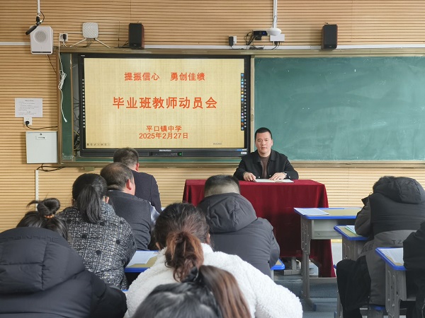本网讯 2月27日,平口镇中学举行2025年“提振信心,勇创佳绩”毕业学科教师动员大会,由办公室主任主持。校长伍文才、教学副校长夏晓新,以及九年级全体教师、八年级班主任和生地教师共40余人参会,共同为学生的学业发展和升学目标出谋划策。 会议围绕“制定目标、分解目标、领取目标、达到目标”展开。首先,夏晓新从教学管理层面,利用数据详细分析了当前毕业学科的教学形势,制定了目标,为班级分解了目标,并对下一阶段的教学工作进行了具体部署。 随后,八、九年级班主任聚焦班级所做的工作进行了汇报,对下一步的班级管理和成绩提升作出了表态发言。十位学科备课组长从学科特点出发,纷纷上台分享了中考备考计划和策略,为教师教学提供了有力支持。 伍文才作了总结性发言,给了毕业学科教师一颗定海神针。他表示学校会为中考保驾护航,提供良好的学习氛围。同时他坚信,狭路相逢勇者胜,只要坚定信心,共同发力,强化措施,精准施策,必将打赢中考的攻坚战。 初审初校:夏明兰
