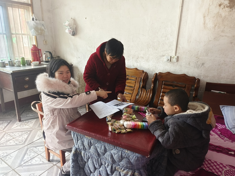 送教中,老师根据每位儿童的实际情况,带领儿童做小游戏、简单的家务活动,让孩子在轻松快乐的氛围中学习颜色、数数、做小手工、进行家务劳动等,帮助孩子掌握知识和动手技能。