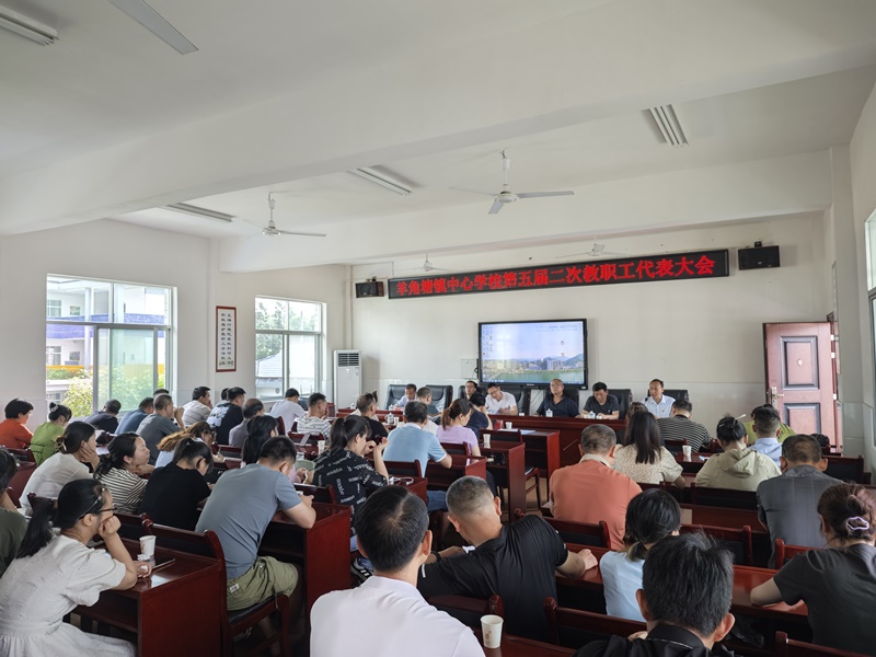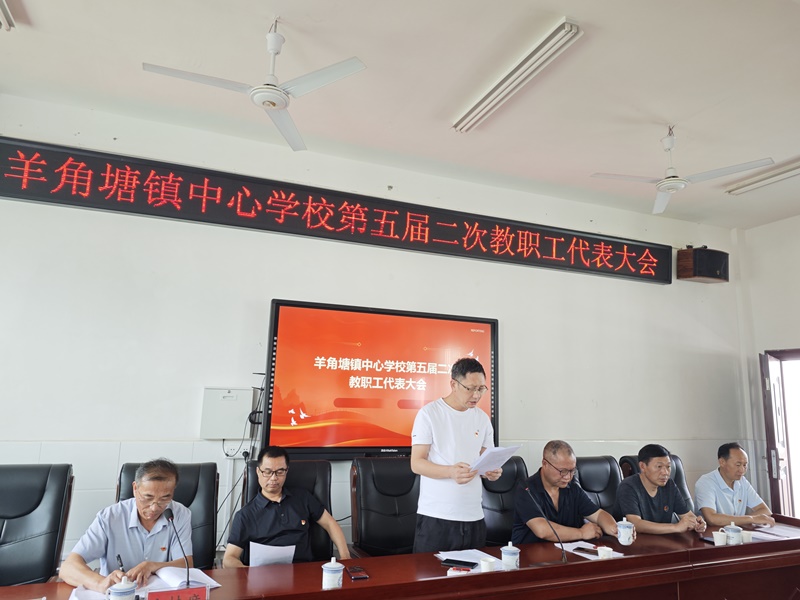 本网讯 5月26日上午,羊角塘镇中心学校成功举行了第五届二次教职工代表大会。 8点50分,在庄严的国歌声中,教代会拉开了序幕。责任督学卢顺吾同志致开幕词,他表示,本次教代会是羊角教育的一次盛会,必将推动羊角教育迈上新的台阶。 该镇中心学校党总支书记、校长王云德同志做了学校工作报告,他全面总结了过去一年取得的成绩,也客观地指出了存在的问题,对2024年的工作做了部署和安排,他要求围绕“教育质量、安全工作、作风建设”三大主题,深入推进“五育并举、集团办学、集体研训、基础过关”的办学思路,努力开创羊角教育新篇章。 大会听取和审议了《学校工作报告》《工会工作报告》《财务工作报告》《工会经费审计报告》《提案工作报告》,表决通过了《任课教师日常工作考核细则》《优秀岗位评选方案》等6项制度和方案。 该中心校党总支部副书记、副校长杨兴同志致闭幕词,他高度评价了本次教代会,与会全体代表积极履职,献计献策,共商羊角教育发展大计,是一次团结鼓劲的大会,更是一次凝聚智慧与力量的大会。