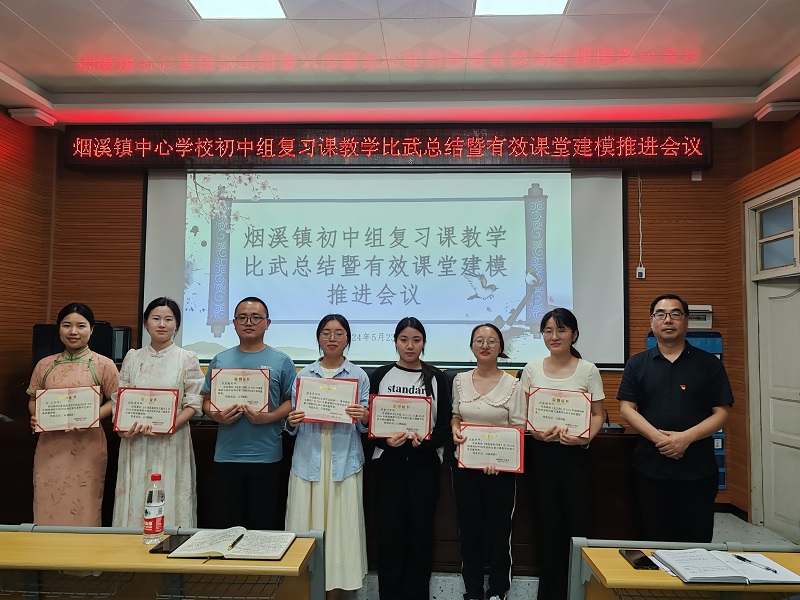本网讯 5月23日,烟溪镇中心学校在烟溪镇中学开展烟溪镇初中组复习课教学比武总结暨有效课堂建模推进会议。会议由中心学校副校长刘娟主持,烟溪镇中心学校校长胡毅、办公室主任刘开颜及烟溪镇中学全体教师参加。 会上,各教研组组长对组内参赛老师的课堂教学做了精彩点评,同时也提出了宝贵的建议。烟溪镇中学校长杨洋从思想可贵,行动见效、课堂可贵,学习见效、时间可贵,重在效率、改变可贵,成长见效四个方面对本次参赛教师予以了充分肯定和对本次活动进行了总结。 胡毅做最后总结发言,他分享了三点感受:一是思想有提高;二是观念上有改变;三是效果上有体现。他希望教师们能够锻造“静心”、坚持“恒心”、树立“信心”、拥有“爱心”,能够在之后的课堂中全面贯彻“以学生为主体,教师为主导,以问题为导向”的教学理念。 会议还对此次教学比武活动中获得优秀的教师进行了表彰鼓励。