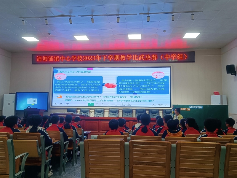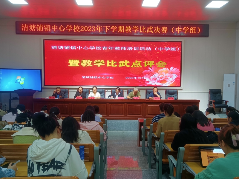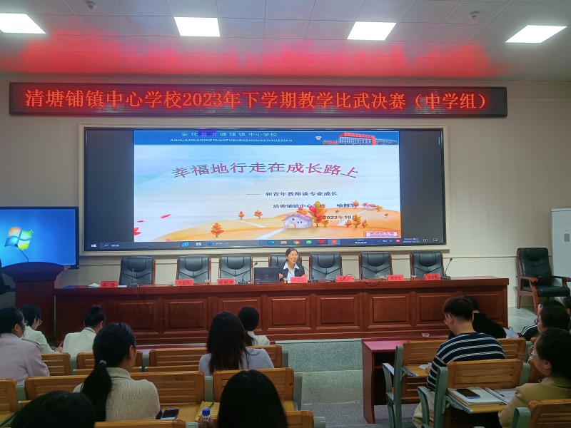 本网讯 10月25日, 清塘铺镇中心学校2023年下学期青年教师教学比武(中学组)决赛在该校多功能报告厅隆重进行。此次比武共有13位新教师参加,评委由中心校机关人员与中学行政组长、教研组长组成。 决赛现场,各位参赛选手仪表端庄,精神饱满,教态自然,语言流利,思路清晰,以最好的状态给评委们带来一堂堂精彩的优质课,诠释了新时代的教育教学理念,展现了该校青年教师深厚的教学功底、教学特色和良好的综合素质。经过激烈的角逐,最终评选出一等奖6名,二等奖7名。在评课环节中,各学科组长对青年教师们的认真准备和精彩表现给予了肯定,并结合自身的教学经验分别从教学设计、语言教态、思政融入、PPT制作及板书等方面进行了细致点评。最后,中心校副校长喻拥军作了《幸福地走在成长路上》专题讲座,对该校青年教师进行专业发展培训,为他们的迅速成长指明了方向。