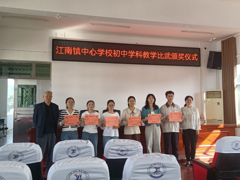 本网讯 9月27日,江南镇中心学校初中教师教学比武在江南镇中学录播室举行,该中心学校李新民、江南镇中学和洞市中学校长、教导处主任和部分教师参加了此次活动。 课堂教学比武分语文、数学、地理三科,由两所中学各派一名选手进行比拼。比武从江南镇中学陈世纪老师教学《乡愁》开始,在低沉、舒缓的朗读中,以拍摄《乡愁》情景剧为架构,引导同学们感悟作者从家愁到国愁的深沉情怀。洞市中学教师蒋子慧执教《乡愁》,以“读-赏-写-悟”为线索,条分缕缕,一步一步带领学生感受母子情、夫妻离、生死别、家国恋。6位老师相继登台,充分展现其教学理念、自身素养和驾驭课堂的能力。整个比赛精彩纷呈,课堂活跃,教学手段多样,教学形式新颖,给参加活动的教师以很深的启发。 经过评定,陈世纪、唐雅璇、付凯勋荣获一等奖,蒋子慧、蒋宇、扶倩获得二等奖。李新民为获奖者颁奖,鼓励两校教师加强教育教研,拓展教学途径,提升自身的专业素质,形成独特的教学风格,相互切磋,共促成长。