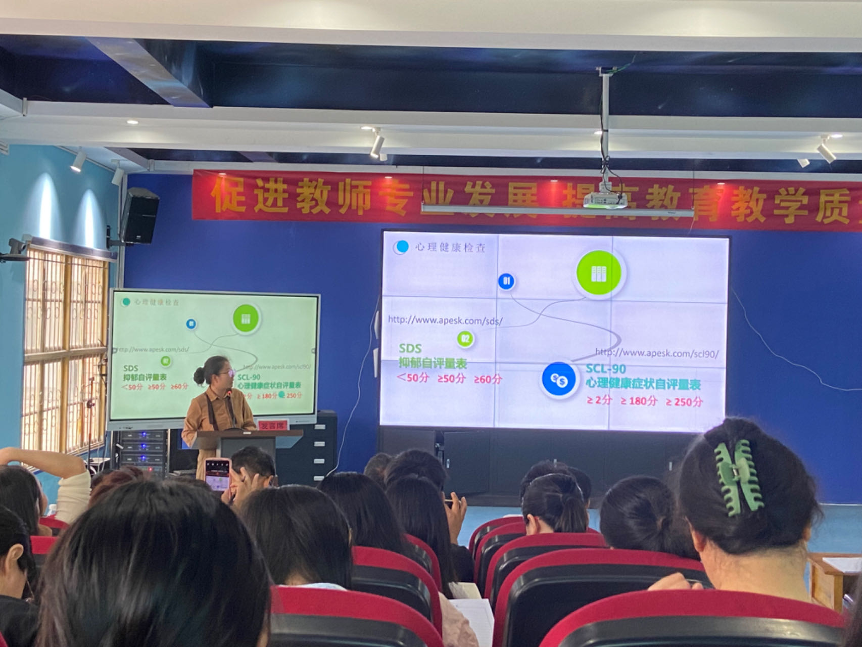 本网讯 8月28日上午,渠江学校的智慧教室里,老师们正在经历一场“心”的旅行。 “大家跟随我,调整好自己坐姿,把手放在肚子上,吸气,感受腹部隆起,默数1.2.3.4……”渠江学校心理健康教师王雯轩正在带领渠江镇全体教师学习腹式呼吸,除此以外,王雯轩还教给了老师们着陆技术、自由书写、冥想等简单有效的情绪纾解方法。 “我们绝大多数人或多或少都有一些心理问题,心理健康与不健康也并无明显界限,而是一个连续化的过程。教师的心理健康状况不容乐观,中国人民大学公共管理学院组织与人力资源研究所和新浪频道对近9000名教师进行职业压力和心理健康调查结果显示,82.2%的教师感觉压力大,一半以上教师已出现心理障碍。先爱自己,才能更好地爱学生。”王雯轩如是说道。 近一个小时的时间里,与会的教师们边做边学,对自己的心理状态有了更深的了解,认识到心理健康的重要性,掌握了调节心理状态的有效方法,有利于今后以更充沛的精力和更饱满的热情投入到教育教学和日常生活中。