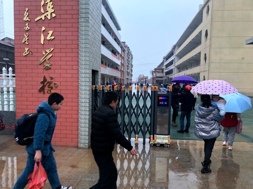 本网讯 2月6日,2023年春季开学日,渠江学校9年级韩子仪开开心心来到学校,惊喜地发现,学校的老校门仅供车辆通行,师生们都从东大门(新校门)出入,她非常高兴,跟同学一起击掌相庆:“学校的新门终于修好了,我们再也不要担心和车辆亲密接触了!”天空下着霏霏细雨,前来送读的家长却异常高兴,为学校的条件改善点赞叫好,拍手称快。