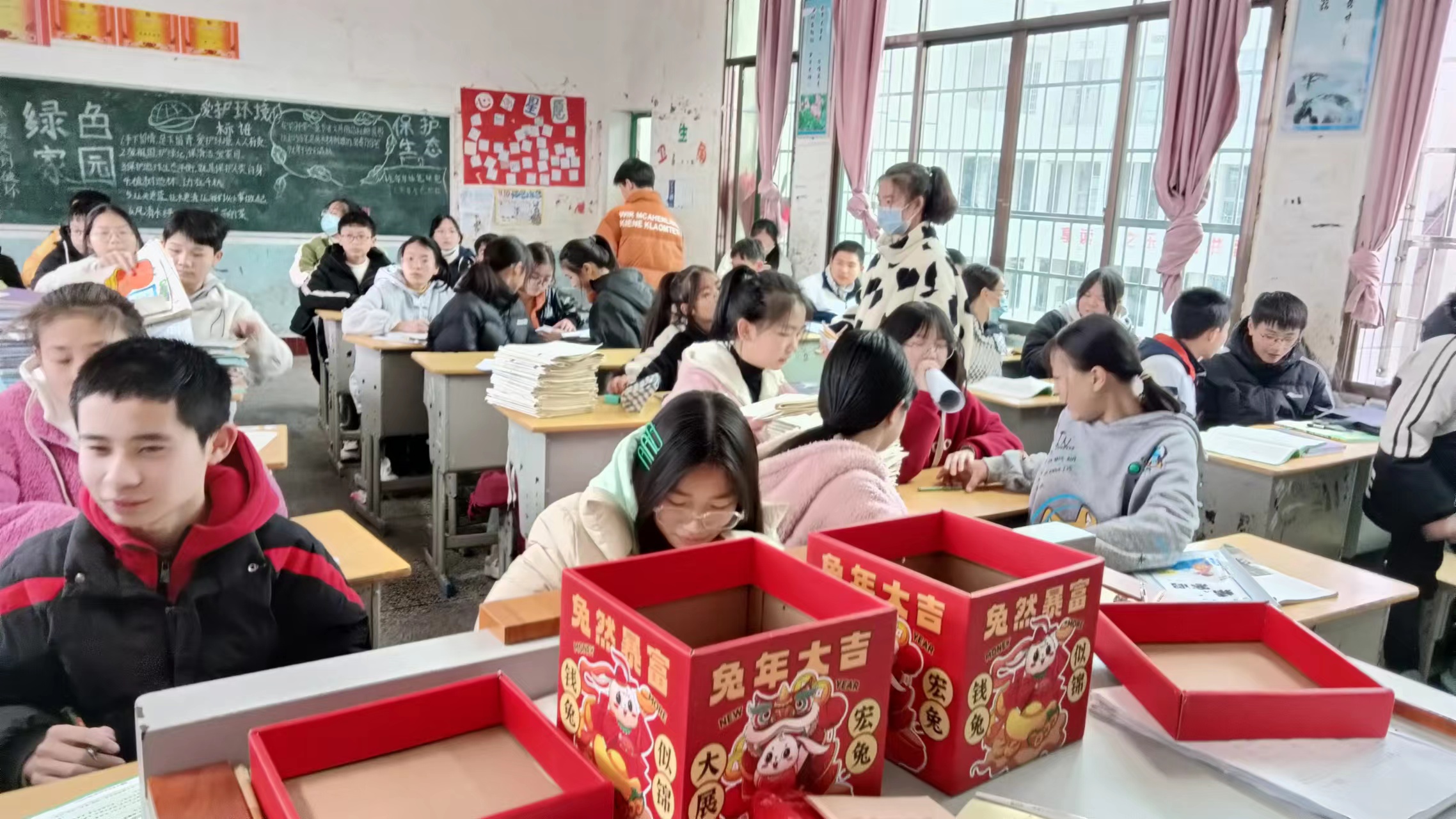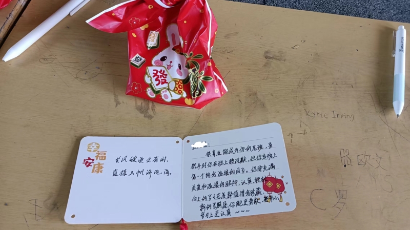 平口中学2103班的班主任老师谭婧媖,更是精心为同学们准备了兔年大礼包,摆在了每个同学的桌上。解开礼包,里面放着一本便签卡和一张系有红色穗花的卡片,轻轻翻开一张卡片,只见上面写着:“**同学,很幸运能成为你的老班,虽然平时你在班上较沉默,但你是班上第一个给我温暖的同学。你那充满关爱和温暖的眼神,认真、积极向上的学习态度都值得我好好珍藏。新的学期,愿你能更勇敢,更开心,学习上更认真……”温馨的话语,殷殷的期盼,在一张张小小的卡片上给人以温暖和奋进的力量。据悉,2103班每个同学的寄语都不一样,是谭婧媖正月间给班上每一位同学精心准备的新年礼物。平口中学2001班的班主任老师刘丽珠则是在每一个同学的桌上放着象征着“平安、甜蜜、红火”的苹果、蛋糕和牛奶;2101班的班主任老师刘艳霞则精心地准备了两个红色的盒子,放在了讲台上,里面放满了各种糖果,同学们嘴里含着糖,想必心里也是甜甜的吧!