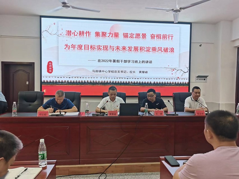 本网讯 8月25日,马路镇中心学校在镇中学会议室召开2022年秋季开学工作会议。中心学校全体机关成员,各校校长、中层管理干部共计四十余人参加大会,会议由中心学校责任督学伍玉华主持。 马路镇中心学校副校长邓云彪宣布了马路镇2022年秋季人员编制、人事异动情况与干部任免通告。副校长王健作了《乘风破浪共奋进,凝心聚力做管理》的工作报告,全面总结了上学期的工作,充分肯定各方面取得的成绩、指出存在的问题,并详细安排部署了2022年秋季学期的各项工作。教务主任邓瑶组织学习并解读《马路镇小学集团化办学实施方案》《马路镇学科带头人实施方案》。 中心学校党总支书记、校长黄攀峰作《潜心耕作,集聚力量,锚定愿景,奋楫前行,为年度目标实现与未来发展积淀乘风破浪》的培训报告,从“构建更优的管理体系、坚守质量为核心的管理目标、坚持民生为上的管理保障”三个方面对全体管理人员进行培训,同时勉励大家在新的学年里,工作要有新思路,发展要有新突破;要坚定信念,毫不动摇,以饱满的精神状态、旺盛的精神全身心地投入到各自的工作中去,迎接新挑战,开创新局面,促使马路镇教育教学质量再上新台阶。
