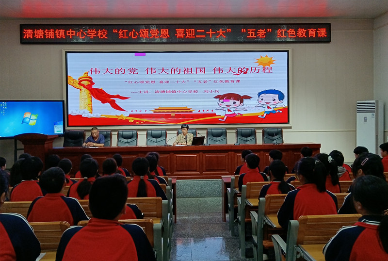 本网讯 5月31日下午,清塘铺镇中心学校在中学多功能报告厅举行“红心颂党恩·喜迎二十大”“五老”红色教育课活动。红色教育课由原清塘铺镇完小校长刘小兵主讲,中心学校工会主席周向星出席,活动由中学副校长吴雄主持。 刘小兵以中国共产党领导和带领中国人民实现从站起来、富起来到强起来的历史飞跃为主线,以实现人民富裕、民族复兴、国家富强的中国梦为主调,展现了中华儿女敢教日月换新天的豪情壮志,励精图治、改革开放的奋斗精神,实现中华民族伟大复兴的中国梦的实干精神,更是用令世界瞩目的成就描绘了一幅美丽中国新画卷。她希望同学们能永葆“闯”的精神、“创”的劲头、“干”的作风,以更加饱满的热情、积极的心态、团结的精神、顽强的意志投入到学习和生活中去,学好知识,练好本领,用优异成绩迎接党的二十大胜利召开。精彩纷呈的讲课赢得了阵阵掌声与喝彩,同学们纷纷表示,一定要努力学习,传承和发扬革命精神,长大报效祖国!(通讯员:张剑文、周向星)