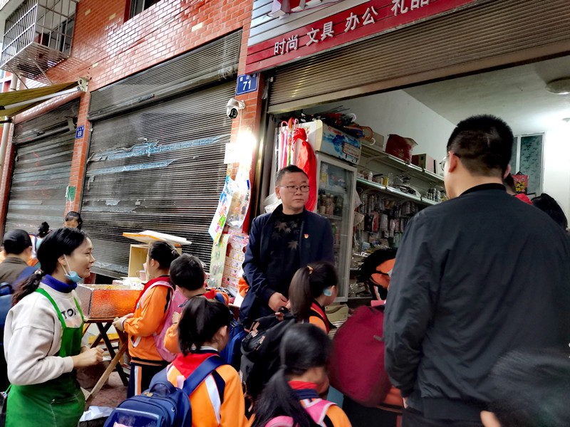 本网讯 10月13日清晨,安化县东坪镇南区管委会副主任、食品安全委员会主任李鲲鹏率东坪镇市监站、应急办、城管执法队、中心学校相关人员,深入城南完小校门口,对100米范围内的流动摊位和食品经营门店开展执法检查。共约谈警示店主4家,指导规范经营1家。