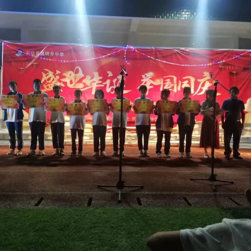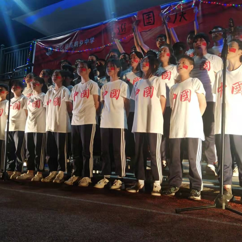 本网讯 9月29日傍晚,夕阳如血,青山如黛。澄清的天宇下,中国结粉红的灯光照在如茵的草坪上,映红了笑脸,翻滚了人潮,响彻着歌声。这是高明乡初级中学在室外举行第五届“唱红歌迎国庆”的班级歌咏大赛。为表达对党、 祖国的礼赞和祝福,提高学生的艺术素养,培养学生的组织能力和编演能力,高明中学近五年来在国庆节前都进行了班级红歌赛。本届红歌大赛分三部分:一是同学们自编自导自己指挥和伴奏的班级红歌比赛,第二部分为各班选送学校的文艺节目,三是部分老师的才艺表演。由于学生的眼界开阔,准备充分,艺术基础扎实,老师指导精心,各班均表现出极高的艺术水平和组织协调能力,红歌赛精彩纷呈,文艺节目多姿多彩,老师的表演更是把气氛带到了高潮。 活动从花灯初上一直持续到万家灯火。残阳、远山、漂亮的中国结路灯、璀璨的灯光、稚嫩朝气的笑脸、中国红的映照,如茵的草地,或清越或高亢或激昂的歌声,把整个山村氤氲成一片仙境般的童话世界。(通讯员 龙腾安)