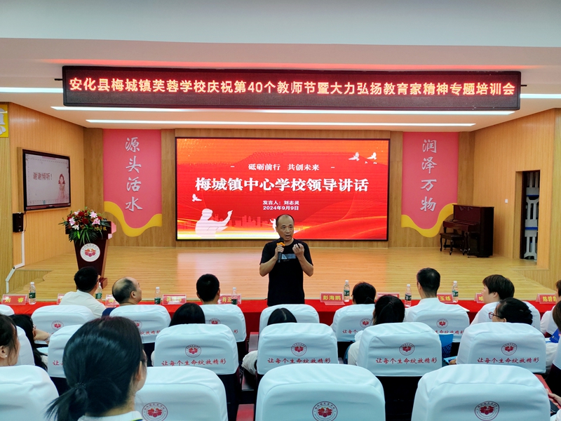 本网讯 9月9日晚,县梅城镇芙蓉学校举行第40个教师节庆祝大会暨大力弘扬教育家精神专题培训会。县梅城镇中心学校党总支副书记刘志灵、项目办主任蒋瑞珲、赞助企业湖南万牧肉食有限公司、天马国际影城、中梅驾校总经理肖正茂以及安化县梅城镇芙蓉学校全体教职工等近百人参会。 会上,芙蓉学校党支部书记、校长彭海鹏首先向所有教育工作者致以节日的问候,向所有受到表彰的教师表示祝贺;对长期以来,关心支持芙蓉教育事业发展的社会爱心人士表示衷心的感谢。同时,她对老师们提出了三点希望:一是做学生喜欢的老师,成为带领学生走向真理的向导;二是努力成为一名教育家;三是关爱学生,引导学生健康成长。 通报表彰了2023-2024学年度芙蓉教育战线上涌现出的先进个人,授予李莉萍等10名同志“梅城镇排名学科”荣誉称号,张淑娟等27名同志“校优秀统考学科”荣誉称号,龙思思等5名同志“校优秀班主任”荣誉称号,杨林涓等3名同志“校优秀非统考科目学科”荣誉称号,谭春松等3名同志“校优秀行管人员”荣誉称号,并予以通报表扬。数学教师郭芳和优秀班主任龙妮寰2位教师代表,结合岗位实际和工作体会作了经验分享,用自己的工作经历向全校教师分享了教学、管理等方面的独家秘诀。学校授牌湖南万牧肉食有限公司、天马国际影城、中梅驾校爱心企业。 刘志灵在总结中说道:作为教师应以赤诚之心、奉献之心、仁爱之心投身教育事业,期望所有芙蓉人凝心聚力奋力书写好芙蓉教育新篇章。 初审初校:谭媛媛 复审复校:俞泽军 终审终校:彭海鹏