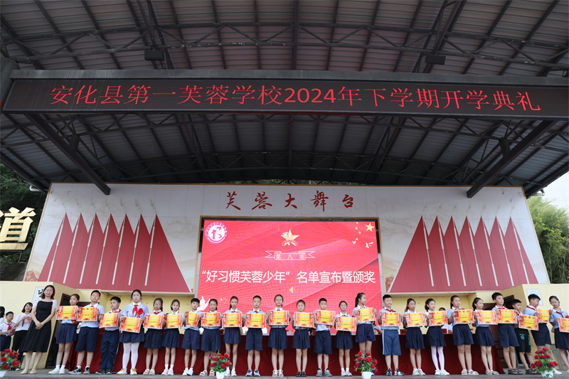 活动中,该校副校长陈晨宣布了荣获“好习惯芙蓉少年”称号学生名单,147名芙蓉学子整齐有序地上台接受表彰,他们朝气蓬勃、精神抖擞,展现了芙蓉少年积极向上、奋发图强的精神面貌。随后,副校长谌专娟宣读了各年级前十名名单,并集中进行颁奖。