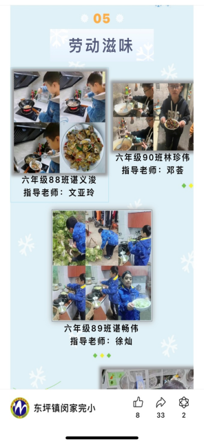 勤学技能,展示劳动成果。“一粥一饭当思来之不易,半丝半缕恒念物力维艰。”只有深刻体会到劳动的艰辛,才能感受生活的不易。在培养兴趣的同时,为更好的展示劳动成效,学校电子专刊“闵星报”开设了专栏“劳动滋味”,定期发布,充分展示学生的劳动成果。很多学生在爸爸妈妈的指导下,做菜、摆水果拼盘、包饺子等,学会自己动手做美食,享受与家人在一起的美好时光,培养了独立自主的能力。