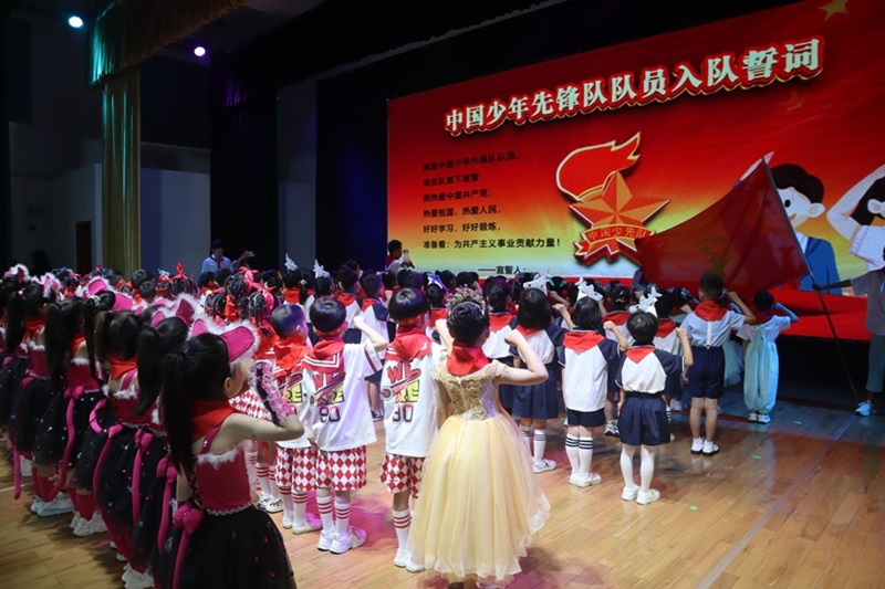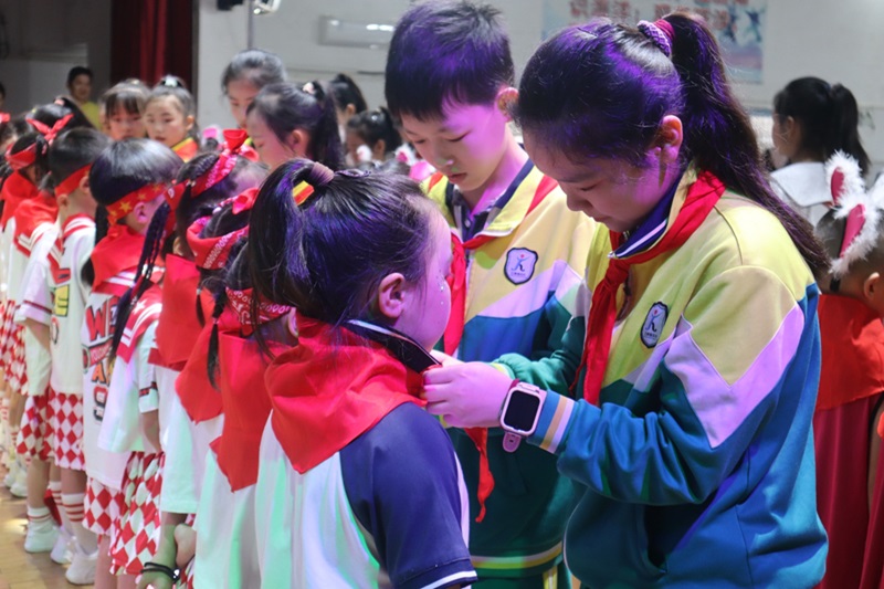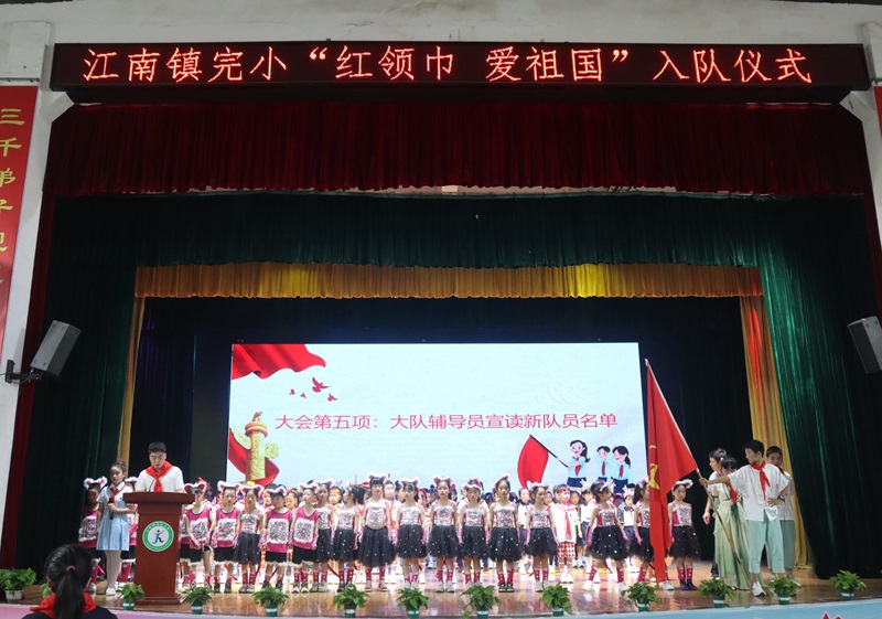 本网讯 5月31日,江南镇完小师生齐聚风雨球场举行2024年“红领巾 爱祖国”新队员入队仪式,共293名新队员加入中国少年先锋队,成为一名光荣的少先队员。 仪式开始,旗手高举鲜艳的队旗,庄严出旗,护旗手们昂首挺胸,矫健有力的步伐踏出少先队员的光荣和使命感。全体少先队员齐声唱响《中国少年先锋队队歌》,表达出对祖国的热爱和对未来的美好憧憬。 少先队大队辅导员夏吉清宣布新队员名单,在鲜艳的队旗下,五年级老队员们为新队员佩戴红领巾,这一刻,新队员们感受到了少先队员的责任和荣耀。全体新队员右手握拳,面向队旗庄严宣誓,老队员重温入队誓词,队员们态度严肃认真,声音洪亮激昂。