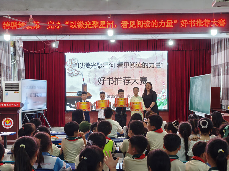 本网讯 5月29日下午,清塘铺镇第一完小在学校多媒体室举行“以微光聚星河,看见阅读的力量”主题好书推荐大赛,学校行政人员以及三、四年级师生参与本次活动。 该校教导处制定了《“以微光聚星河,看见阅读的力量”清塘铺镇第一完小好书推荐大赛活动方案》,本次活动分为两个阶段,第一阶段:初赛,各班内部进行初赛,每个同学都参赛,第二阶段:各班推荐3名同学参加决赛。三、四年级各班共推选出25名选手参加了本次比赛。选手们在舞台上尽展风采,对《稻草人》《昆虫记》《西游记》《爱的教育》等中外经典名著进行了强烈的推荐和精彩的讲述,引起了在场评委们的啧啧称赞和听众的强烈共鸣,整个比赛过程掌声不断,极大地调动了同学们读好书、多读书、好读书的热情。经过激烈的角逐,最后评选出了吴悠、熊璟轩等4名特等奖,吴歆瑶、邓佳萱等11名一等奖,邹文舜、龚婧瑶等10名二等奖。 该校教导主任蒋飞艳对本次活动作了总结发言,她希望通过此次好书推荐活动能让孩子们发现并阅读更多的优秀图书作品,提升孩子们的阅读能力和阅读兴趣,养成良好的阅读习惯,快乐阅读,健康成长。
