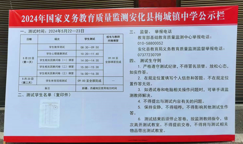 本网讯 5月22日至23日,梅城镇中学圆满完成2024年国家义务教育质量监测工作。 作为义务教育监测样本校,本次质量监测对象为2024年春季学期义务教育阶段八年级数学、体育与健康、心理健康教师和班主任教师、学校校长以及八年级随机抽测的30名学生。 据悉,为组织好本次监测工作,该校领导高度重视,精心组织,成立了专项工作领导小组,对各处室进行责任分工,并制定了详尽的实施工作方案及质量监测应急预案等,落实岗位责任,并对全体监测工作人员进行多轮培训,确保相关人员熟悉监测流程。合理规范布置监测场地,提前准备监测器材和文具,反复调试监测设备,对学生测试室、校长和教师网络问卷填答室、测试现场办公室和保密室,反复排查,做到合乎规范,无一疏漏。 整个监测工作,在责任督学和监测教师的监督和指导下,在学校严密组织下顺利进行,监测流程环环相扣,有条不紊,工作人员职责明确,操作规范。检录核对严谨规范,学生答题测试及问卷填写规范认真。检查封装一丝不苟、检测工具回送及时快速。 该校党总支书记、校长喻选民表示,将以此次义务教育质量检测为契机,树立正确的教育质量观,严格落实国家课程计划,转变教育管理模式,不断改进教育教学方法,促进学生身心健康发展,为办好人民满意教育贡献力量。