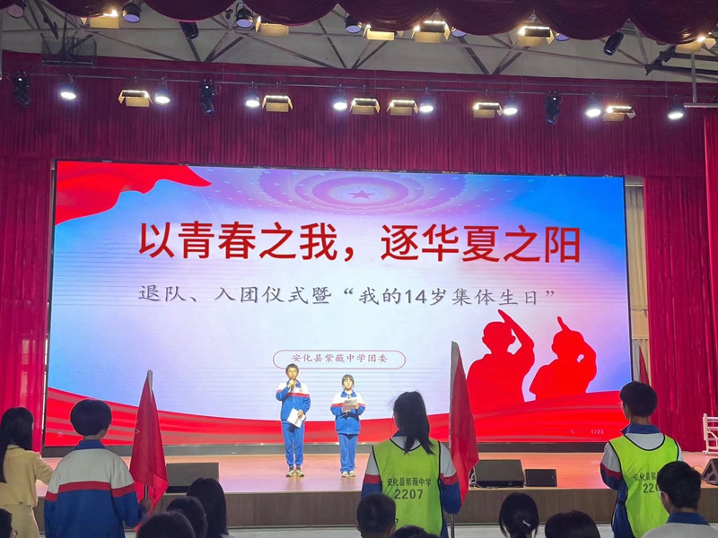 本网讯 4月30日,安化县紫薇中学举行“以青春之我,逐华夏之阳”离队、入团仪式暨“我的14岁集体生日”主题活动,八年级全体师生、九年级新老团员参加此次活动。 此次入团仪式在庄严的国歌声中拉开帷幕。本次仪式由三个篇章组成:“回忆童年”离队仪式、“你好,14岁”和“扬帆启航”入团仪式。新团员们在仪式上郑重宣誓,表示将牢记团员使命,发扬团的优良传统,努力学习科学文化知识,积极参与社会实践和志愿服务活动,争做一名有理想、有道德、有文化、有纪律的共产主义事业接班人。 仪式上,新老团员们为新团员们佩戴了团徽,标志着他们正式成为了中国共产主义青年团的一员。新团员们表示,他们将倍加珍惜这一荣誉,不断提高自己的政治觉悟和组织纪律性,努力为团组织增光添彩。 |