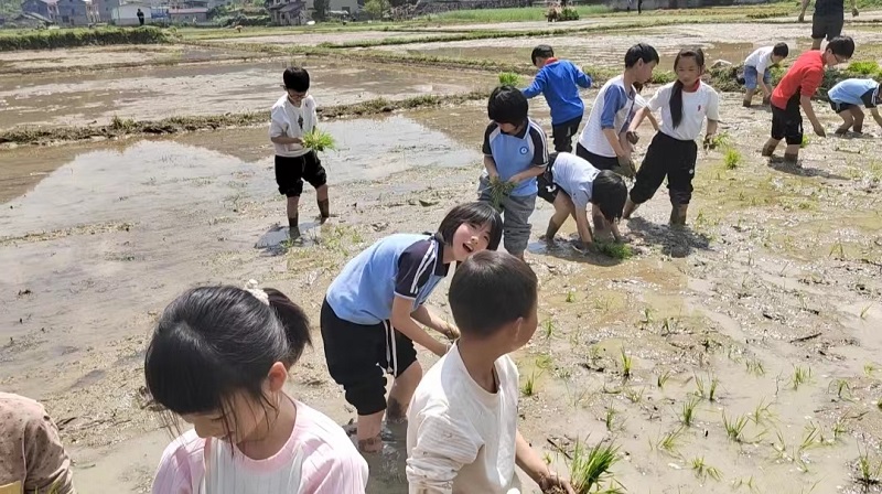 在老师的带领下,同学们怀着激动、好奇的心情来到了学校附近的农田里学习插秧。大家首先站在田坎上认真观察,只见农田里的村民左手分苗,右手插秧,动作娴熟而有力。村民一边为学生们展示正确的插秧方法,一边讲解基本要领。学生们在村民的指导下,开始下田尝试插秧。