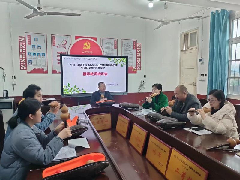 本网讯 3月13日,东坪镇杨林完小举办了一场益阳市“十四五”规划立项课题“双减政策下器乐教学促进农村小学音乐教学有效性提升的实践研究”器乐教师培训会,课题组成员全程参与。 此次培训旨在通过培养一批具备器乐教学能力的教师,将器乐教学融入农村小学的日常教学中,进一步丰富校园文化生活,提升学生的艺术素养。 培训会上,主持人龙艺平首先向全体与会教师介绍了器乐教学的意义与价值。她强调,器乐教学不仅能够提升学生的音乐鉴赏能力,还有助于培养学生的团队协作精神和创新意识。随后,她亲自示范并教授了葫芦丝的吹奏技巧,她耐心细致地讲解每一个动作要领,确保每位教师都能掌握基本吹奏方法。 该校校长瞿鹏对本次培训会进行了总结。他充分肯定了培训会的成果,并希望全体教师能够珍惜这次学习机会,将所学的器乐教学技能运用到实际教学中去。同时,他也鼓励教师们积极参与课题研究,为学校的教学改革和发展贡献自己的力量。