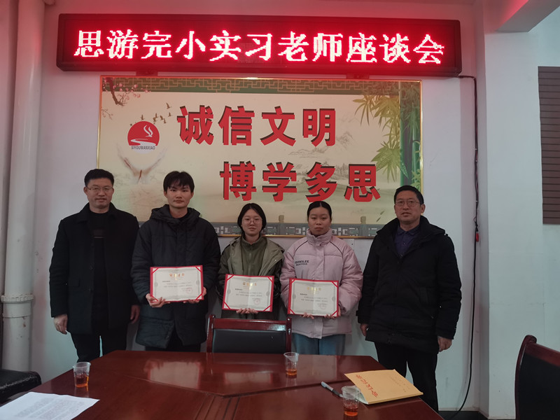 本网讯 1月19日,思游完小举行了实习老师座谈会,肯定了三位实习老师半年来的工作,会议由教导处主任孟振宇主持。 孟振宇指出,三位优秀的实习老师在思游完小一个学期的实习经历即将结束,他代表个人和学校表示非常的不舍,三位老师来学校之时,学校师资困难,三位老师以兢兢业业的精神、不怕困难的态度、专业的水准,为学校解决了很多的困难,自身也得到了极大的提升。 三位实习老师也作了发言,谈了实习期间的收获与感想,并对所有帮助过他们的领导、同事表示了感谢。 校长张再初在讲话中指出,实习是一段经历的结束,也是另一段经历的开端。他代表思游完小及各班的学生向他们表示感谢,并提出了希望,希望他们以后不管在哪里工作,希望他们记得思游完小,记得思游完小所有的朋友们,希望以后一直保持现有的态度,将他们在思游完小所得到的锻炼,所学的知识真正运用到今后的学习、工作、生活之中,同时也由衷的希望三位老师能在毕业以后都能工作顺心,前程无量! 会后,还向实习老师颁发了荣誉证书,赠送了纪念品,仪式感满满。 ![]() ![]()