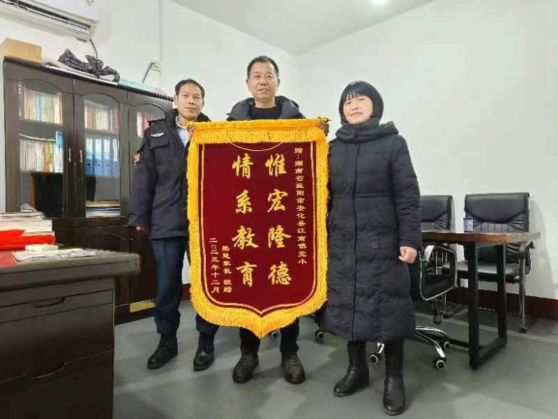 本网讯 “感谢贺校长,感谢罗主任,孩子现在能开开心心上学了,我也能安心工作了”。1月15日,江南镇完小学生家长熊慧在向学校赠送锦旗时说道。 该校政教主任罗明亮介绍,熊慧的孩子因被该班部分学生孤立而产生了厌学情绪,得知该情况后,贺剑伟、罗明亮和班主任多次与该生沟通交流,并在该班开展了“防校园欺凌”“我们是好朋友”等主题活动,最终孩子们握手言和,问题圆满解决。家长对此非常满意,向学校赠送“惟宏隆德 情系教育”锦旗,以示感谢。 据了解,该校通过家长会、“百名教师进万家”、校长接访、阳光服务、特邀家长代表等形式,全面了解家长对学校方方面面的诉求和意见,对症下药,及时有效地解决了群众“急难愁盼”,赢得了社会各界的好评。(通讯员 刘红军)