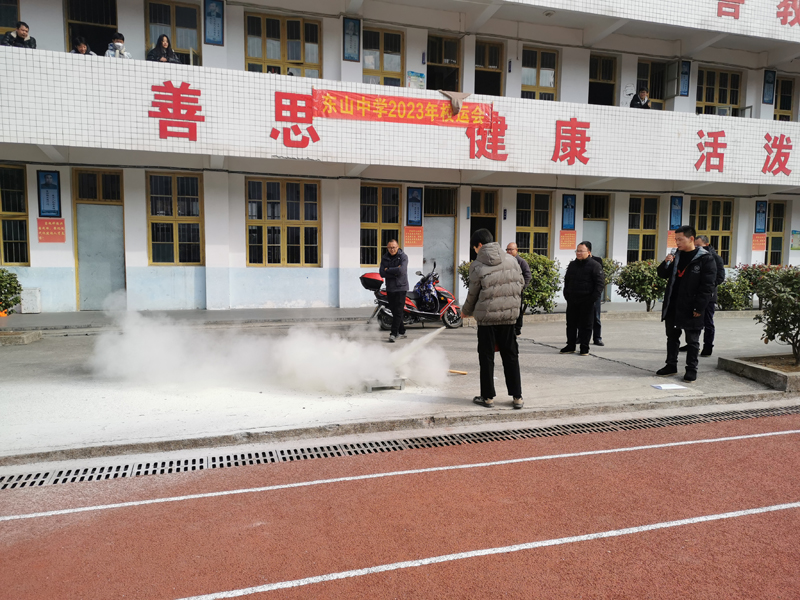 本网讯 12月27日,大福镇东山中学进行了消防安全疏散演练和灭火活动。 一阵急促的警报声响起,学校安全专干严振宇迅速组织全校师生疏散逃生,行政人员负责在教学楼各个楼梯口指挥疏散。班级里正在上课的老师立即告知学生疏散地点,指导学生用手巾掩住口鼻,俯首低行,从前、后门有秩序地跑出教室,从指定楼梯口奔向操场。班主任及任课教师紧跟学生身后,在楼梯口组织本班学生有秩序地逃生,按指定路线快速进入操场集合,并马上清点人数立即上报指挥员,指挥员再把全校疏散情况上报给总指挥。 随后,在学校操场前面的水泥地面上进行了灭火演练。严振宇解说灭火器的使用方法,陈鑫鑫老师演示灭火,然后现场抽选几名学生上台操作灭火器灭火。