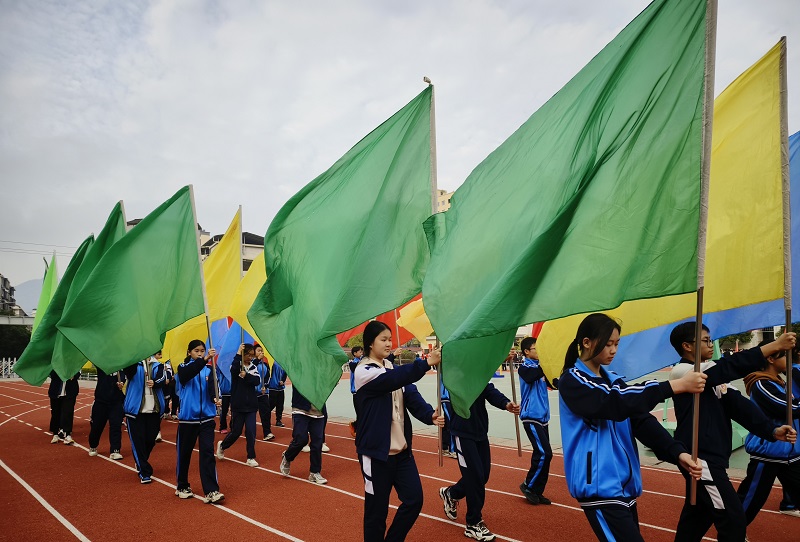 本网讯 11月22日,平口中学第十九届学生运动会在田径场隆重开幕,全体师生齐聚一堂,共赴这场精彩的体育盛会。 上午8:30,伴随着高昂激昂的《运动员进行曲》,国旗队、会徽队、彩旗队、裁判员队迈着铿锵有力的步伐率先入场。接着,18个班级方阵迈着整齐的步伐依次走向主席台,他们意气风发、气宇轩昂,响亮的班级口号久久在校园回荡,充分展现了平中学子的满腔热情和精神风貌。同时,开幕式上各班级节目精彩纷呈,他们或手持专业用具,展示出技能实力;或舞姿灵动,跳出青春与活力,其中优雅的古典舞、极具特色的傣族舞、活泼欢快的啦啦操、热情似火的拉丁舞等表演令人目不暇接,迎来阵阵掌声和呐喊。 该校副校长李秋庭致开幕词,对本次运动会的筹办人员表示最真诚的感谢,希望同学们加强体育锻炼,追求卓越,展现高昂的斗志和顽强拼搏的精神。接下来,裁判员代表和运动员代表分别进行了宣誓和讲话。 据悉,此次运动会为期两天半,比赛设置了100 米、200 米、800 米、1500米、立定跳远、引体向上等个人项目,男女迎面接力、拔河等团体项目。 |