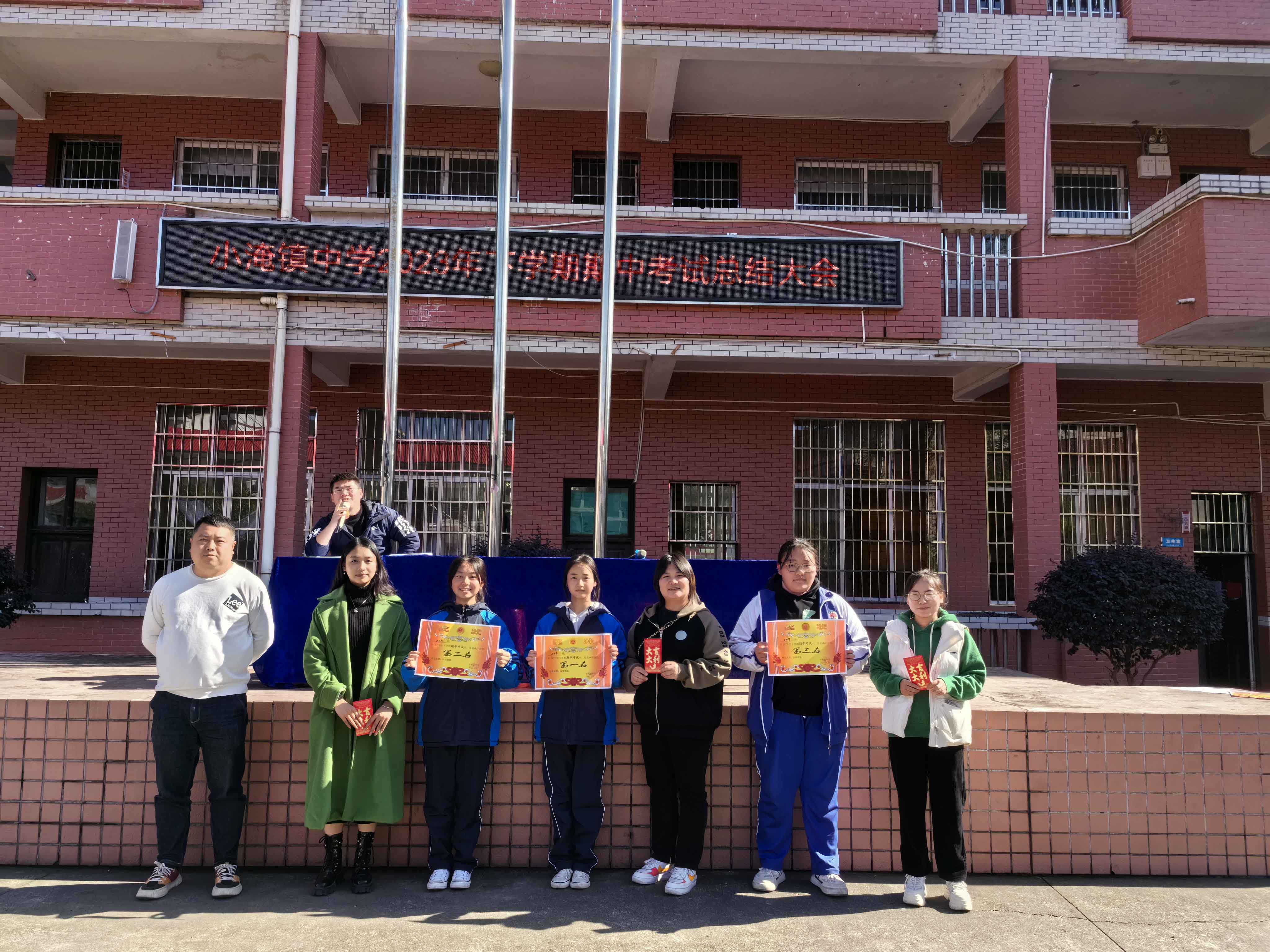 本网讯 11月17日,小淹镇中学组织开展2023年下学期期中考试总结暨表彰大会,会议由教导处副校长陈亮主持,小淹镇中学全体师生参与。 在冬日的暖阳中,期中考试总结暨表彰大会拉开帷幕。教导处主任欧阳旺对于本次期中考试作了全面而细致的分析,对各年级、各科目、各班级作了横向对比,既指出了上半学期大家学习中的不足,也指明了下学期努力的方向。在大会中,优秀学生代表、优秀科任教师、优秀班主任分别进行了发言交流。伴随着热烈的掌声响起,各年级优秀学生纷纷上台领奖,政教处主任李霆恺为获奖同学颁奖,据统计,此次一等奖获得者30人,二等奖获得者55人,三等奖获得者54人,另有15人获得鼓励奖。 副校长陈亮作总结性发言,对下一步工作进行了部署,激发了师生们勤奋耕耘和好学上进的动力,整场大会在一片催人奋进的氛围中圆满落幕。
