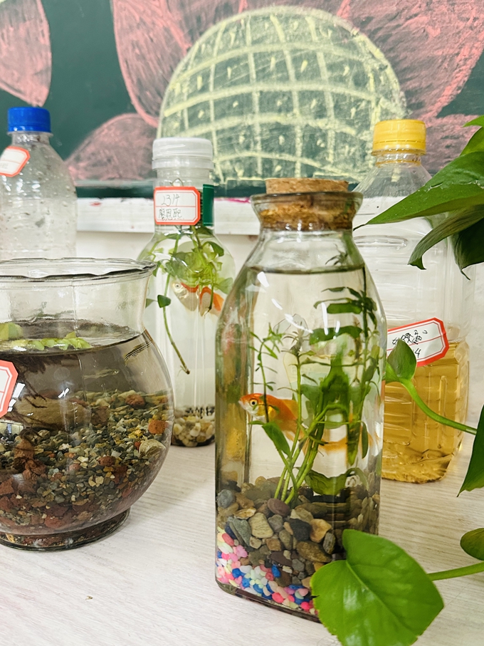 生态瓶是一个微型的人造生态系统,用水、鱼、植物和砂石就可做成一个立体的生态景观。孩子们充分发挥自己的想象力,利用矿泉水瓶,奶茶瓶等废弃物制作生态瓶,他们将泥沙、石头、贝壳、水草等放入生态瓶中,再放入几条小鱼,千奇百怪、五彩斑斓的水世界就形成了。这些生态系统具有完整的成分——包括非生物部分与生物部分,在这些微型的小世界中正在发生物质的循环和能量的流动。