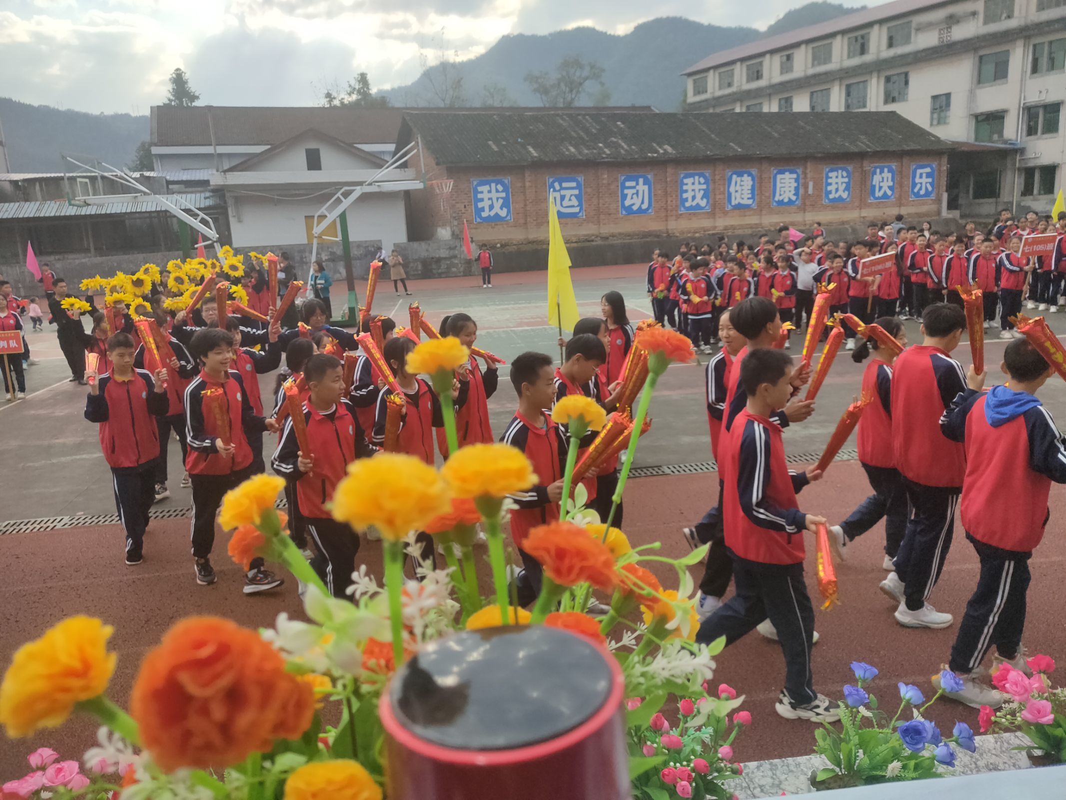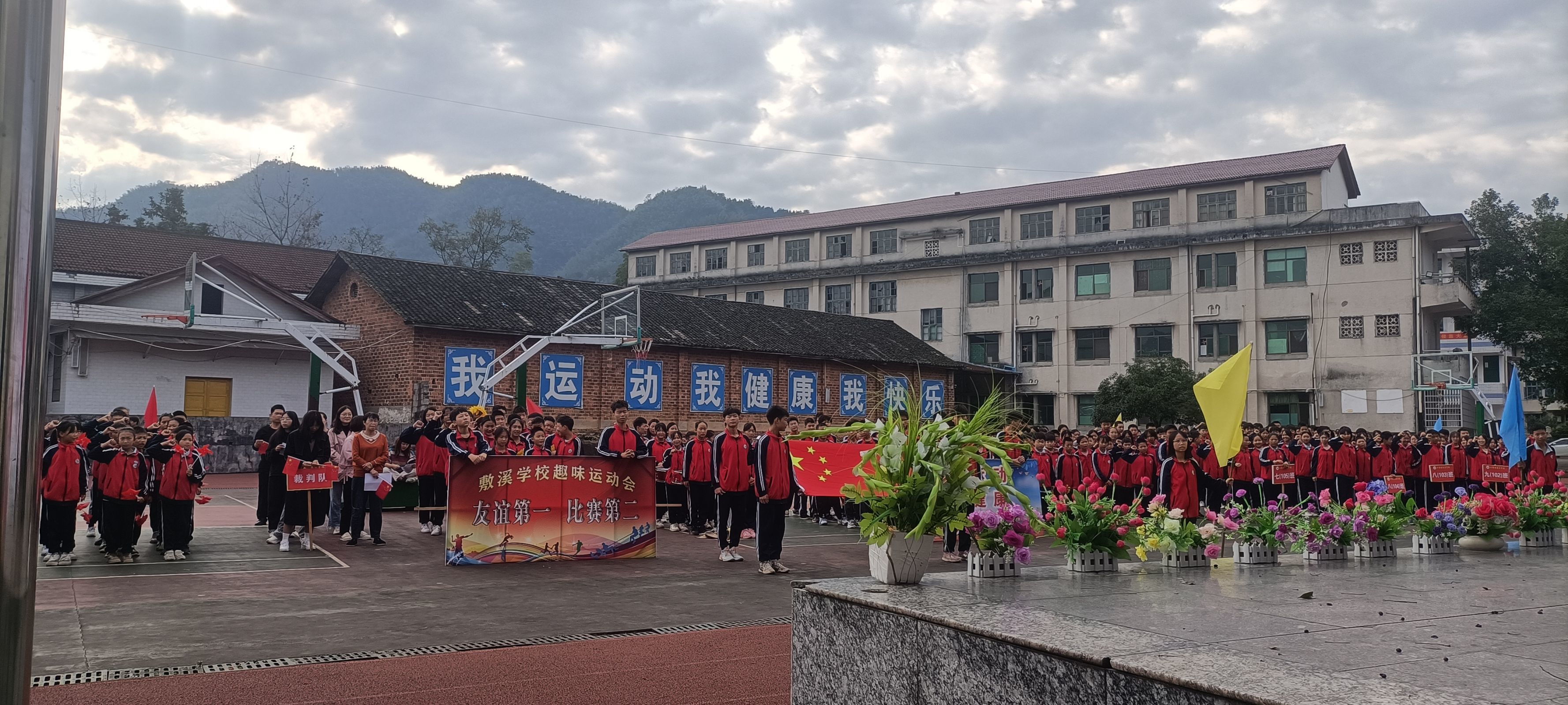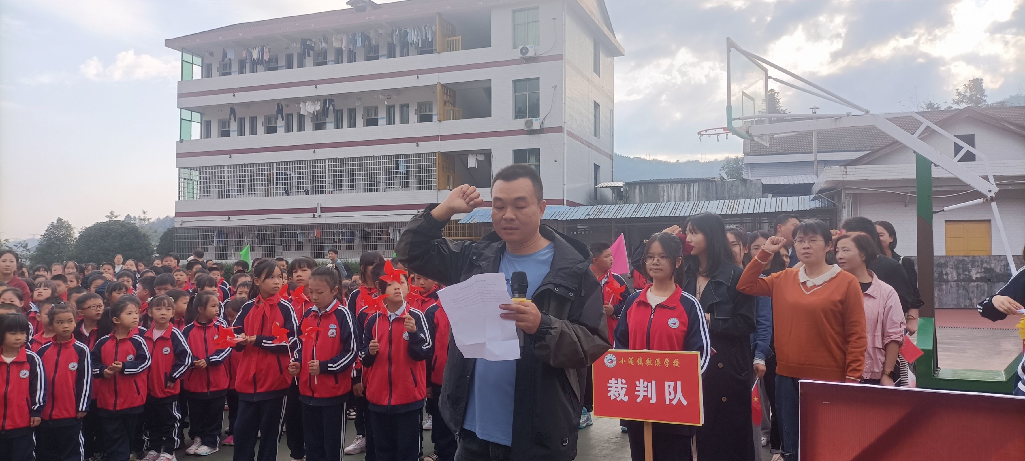 本网讯 10月24日上午,小淹镇敷溪学校秋季趣味运动会开幕式在操场隆重举行。运动会以“扬体育精神,展运动风采”为主题,激励广大师生以运动风采诠释奋勇拼搏、团结协作的精神。 伴随着欢快有力的运动员进行曲,国旗方阵、彩旗方阵,向日葵方阵,火炬方阵,风车方阵,掌声方阵,迈着铿锵有力的步伐,以饱满的精神状态依次入场。英姿飒爽的鼓号队方阵,踏着矫健整齐的步伐,和着清脆有力的鼓点踏步前进。裁判员方阵最后入场,他们是规则的坚守者,更是赛场上胜利的守望者。彩旗迎风飘扬,喜庆而热烈,14支班级代表队依次走过舞台,踔厉奋发、笃行不怠向前行。 学校副校长刘驹为本次运动会开幕致辞。陶智海老师和罗旋同学分别作为裁判员代表和运动员代表进行庄严宣誓。最后,陶武军校长宣布,敷溪学校趣味运动会正式开始。
