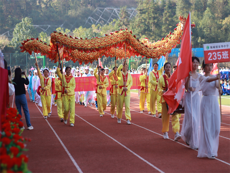 本报讯 10月18日,梅城镇东华中学举行第三十八届田径运动会开幕式。 彩旗于秋风中纵情挥舞,方阵列队依次在主席台前精彩亮相。各班精心筹备,在激昂的音乐声与主持人热情洋溢的班级解说中大踏步地经过主席台前,搞怪可爱的袋子舞,色彩绚丽的扇子舞,飞奔的大国旗,精美的汉服,空灵的气球,舞动的金龙,咆哮的毛狮,铿锵的锣鼓等激情演绎,创意迭出,青春的力量一浪高过一浪。特别是239班师生将“更快”“更高”“更强”的奥林匹克精神与“更团结”“更好”的班级精神融合在一起,形成了独特的班级“运动五环”匠心独运、配合默契的入场方式,令在场的老师、家长赞不绝口。 依次是国旗班升国旗、副校长肖智致辞、裁判员与运动员代表宣誓。最后,学校党支部书记、校长喻彦平宣布运动会开幕,全场掌声雷动。据悉,本次运动会得到了安化现代医院的鼎力支持,全程提供医疗保障服务,并将长期赞助学校足球队的建设。