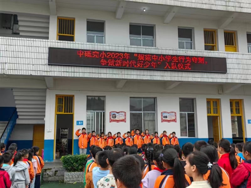 本网讯 10月13日,中砥完小举行“规范中小学生行为守则 争做新时代好少年”入队仪式,庆祝少先队建队74周年。 入队仪式前,该校大队辅导员谌骞组织进行了队前教育,在“队前教育”课上,同学们也更加明确了加入中国少年先锋队的意义。出队旗、唱队歌,活动在嘹亮的歌声中拉开序幕。少先大队辅导员宣读了新入队队员名单,11名学生光荣地加入了中国少年先锋队。随后,老队员为新队员佩戴红领巾,新老队员互敬队礼。新队员们骄傲地挺起胸、握紧拳,跟着老队员李佟珍进行庄严的入队宣誓,响亮的誓词,彰显了同学们争做优秀少先队员的信心和决心。 该校校长李建新寄语少先队员们用自己的热情与智慧为红领巾增光添彩。