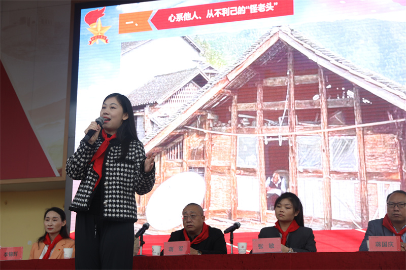 仪式上,红领巾巡讲团成员李惠玲老师、红领巾讲解员廖贝雅进行了精彩的宣讲,她们通过寻访唐上君老人,让全校师生了解了这位鲐背之年的老人对教育的热情以及对学生无私地付出。随后,家长代表张敏、44中队谌颖诺、19中队潘思呈分别进行了发言。