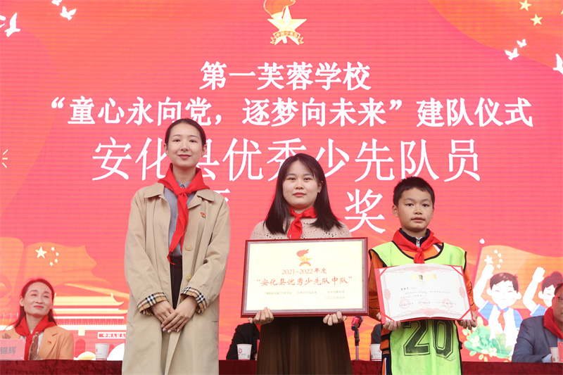 仪式中,由各级领导对“红领巾奖章”二星章、安化县优秀少先队员,团县委、县少工委红领巾特色章——“实践章”荣誉获得者进行了颁奖。