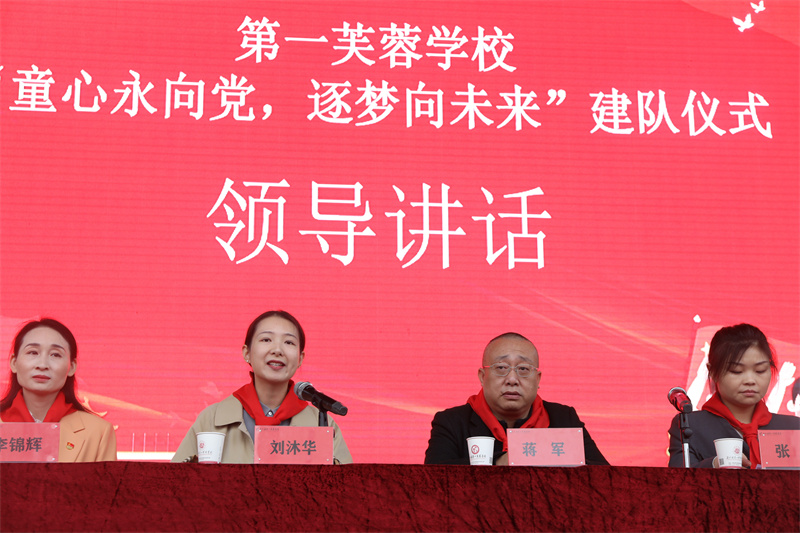 刘沐华对新入队的少先队员们表示了热烈祝贺,对少先队工作者们的辛勤付出表示了崇高的敬意。并提出了三点希望与大家共勉:一是希望全县各级各类学校高度重视少先队工作;二是希望辅导员老师们用心用情做好队辅工作;三是希望少先队员们不断争先向上。 安化县第一芙蓉学校党支部书记、校长蒋军表示,希望新队员们拥有一颗感恩的心,多为他人着想,多为集体着想,时刻以少先队员的标准严格要求自己,在少先队组织中历练,为胸前的红领巾增光,为学校添彩。