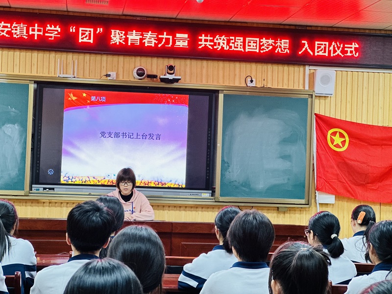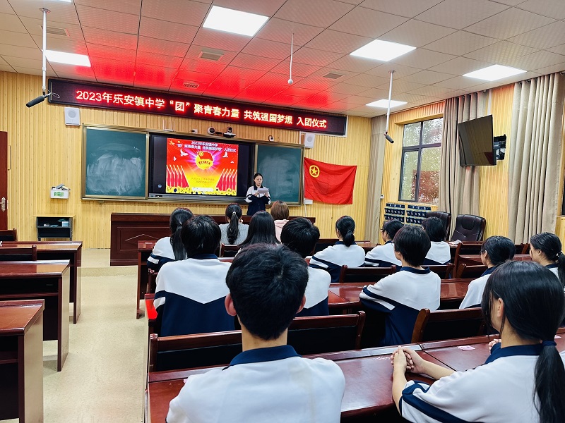 本网讯 10月12日下午,乐安镇中学举行“团聚青春力量,共筑强国梦想”入团仪式。 在庄严的国歌声中,乐安镇中学新团员入团仪式正式开始,学校团委书记蒋依同志宣读新团员名单,本期共有13名同学加入团组织。在优秀团员陈佳怡的领誓下,各位新团员面向团旗、右手握拳、举目过肩,在团旗下庄严宣誓,每个新团员在高喊出宣。为进一步做好新形势下共青团工作,乐安镇中学坚持以“党建带团建,团建促党建”的工作思路,党员代表蒋豪同志给新团员上了团课——《团员的权利与义务》,进一步树立成为一名团员的光荣感与责任感。来自九年级的老团员陈瑾同学、新团员肖文凭同学代表先后发言, 说出了所有团员的心声,立志做一名优秀的共青团员,努力学习,做品学兼优的好学生。 学校党支部书记蒋凤表示对新团员热烈的祝贺和真挚的欢迎,她表示,加入团组织是人生的新起点,要坚定理想信念,提高自身道德品质,争做新时代好少年,希望你们不仅在形式上入团,更要在思想上入团。
