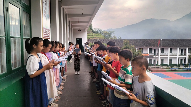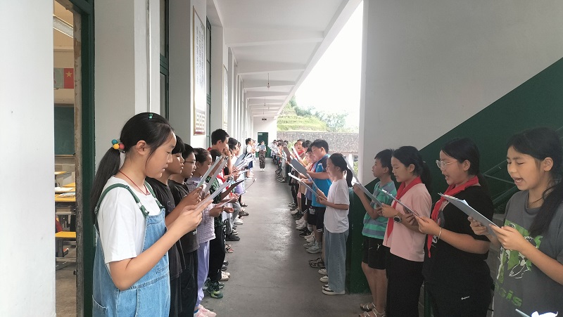 本网讯 9月20日清晨,激情的《岳阳楼记》诵读声响彻马路镇苍场完小上空,这是该校开展每日晨诵经典诗词五分钟活动。 今年开学以来,该校出台了晨诵经典五分钟活动方案,根据方案要求,每天早自习前五分钟分低高年级两个组别,低年级组诵读经典律诗绝句,高年级组诵读经典名篇。每一周诵读一首或一篇,诵读时各班分列走廊两排,手托诵读板,高声诵读。自项目开展以来,学生在校期间,早上迎着朝阳,孩子们意气风发地诵读诗词,成了该校一道靓丽的风景。 据该校教导主任介绍,手托托板,更有仪式感;大声诵读,有利于培养学生的自信。同时也是对原来自由诵读诗歌五分钟的一次尝试变革。