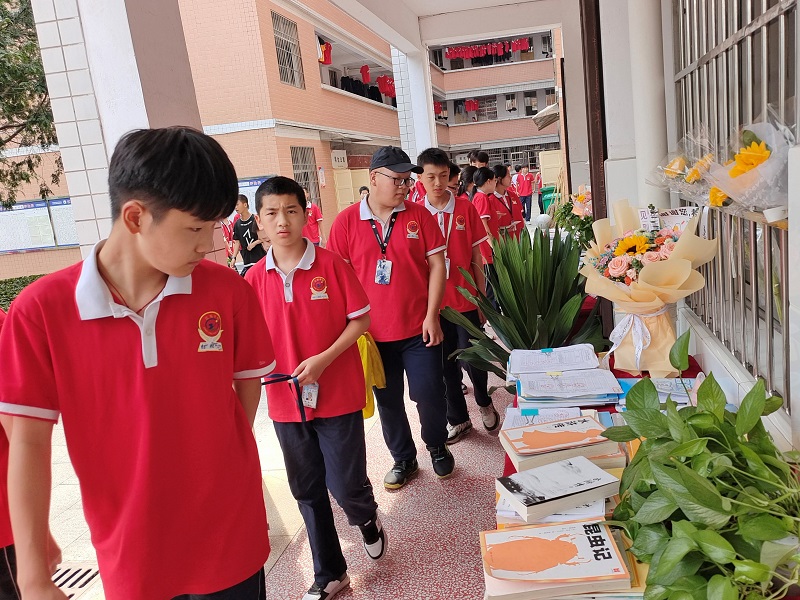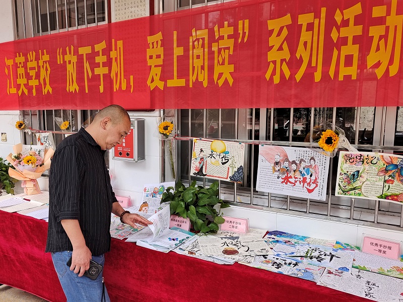本网讯 9月13日,安化县江英学校初中部教学楼一楼的走道上出现了一条长长的“书摊”,吸引了上千名师生停下了脚步,这是该校开展“放下手机,爱上阅读”系列活动优秀学生作品展活动。 “这些孩子真不错!把书读到了骨子里。”县书法协会副主席、书法教师王国千独自在“书摊”上浏览着,久久未能离去。 “我们到‘书摊’去看看。”初115班的50名学生排着整齐的队伍来了。他们拿起了一张张“手抄报”,翻开了一本本“学习笔记本”,打开了一篇篇“学习心得和体会”“我的暑假生活”“我的生活感悟”“我的梦想”,以及诸多的书法、绘画和手工制品,还有许多的推荐书籍。“啊!我们走进了‘书’的海洋,我们走进了学习的‘天堂’!”孩子们兴高采烈,喜不自胜。最后,同学们来到了阅览室,只见室内座无虚席,那沙沙的翻书声,让他们又一次感受到了读书的乐趣。 据学校党支部副书记兼初中部校长戴思妹介绍,此次活动是为了展示学生在暑假期间里的优秀读书作品,以引导学生们与书为友,多读书、读好书、好读书,增进沟通交流,收获别样一样的“兴趣和乐趣”。