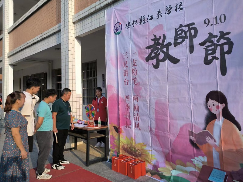 本网讯 “祝老师教师节快乐!”“欢迎老师参加,人人有奖。”9月10日,安化县江英学校初中部教学楼一楼的大门口,悬挂着一条写有“一支粉笔,两袖清风;三尺讲台,四季耕耘”——“教师节·快乐”的巨大横幅,旁边摆放了许多精美礼品,设立着一个“幸运奖”罗盘,站立着一群微笑致意的学生,这是该校团委和学生会联合组织开展的“教师节·献礼老师大放送”活动。 据了解,这“一份份特殊的教师节礼物”,有“红红火火、甜甜蜜蜜、好事发生、书香满怀、‘橙心’如意、事业旺旺”等16个内容。当转盘转动后,指针停留在“何处”,就能获得何种“礼物”。礼品有糕点、糖果、饮料和各种水果等等。 “哇!我中了一包糕点。”“哇!我中了一袋水果。”老师们排着长长的队伍,在孩子们春风满面、彬彬有礼的引导下,开心地转着转盘,目不转睛地盯着指针,那幸福的笑脸就像是刚开的花儿。 “在教师节里,能收到这样一份特殊的教师节礼物,真是太幸福了!”初113班班主任老师任俊杰一手护着孩子们送给她的鲜花,一手提着刚刚中了奖的“特殊礼物”,久久未能平静。她发誓:决不辜负孩子们的感恩之心,只有用努力工作来回报孩子们对老师的厚爱。