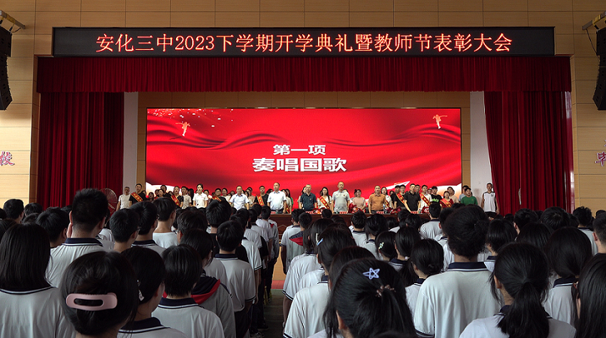 本网讯 9月9日上午,安化县第三高级中学在学校礼堂举行隆重开学典礼。本次典礼既是对新学期的欢迎仪式,也是对即将到来的教师节的庆祝。 典礼开始前,由各班代表向各位教师送上花束表达感谢与祝福,随着教师们陆续就座,开学典礼正式开始。典礼现场,校长黄梦林作新学期工作报告,对2023年上学期的学校工作进行回顾与总结,在对优秀教师、优秀学生给予表彰的同时,黄梦林鼓励师与师、生与生之间多交流、多学习,共同进步。随后,优秀教师代表、优秀学生代表陆续发言,分享自己的经验以供学习。 开学典礼完美收官,在专业摄影团队的指导下各教师、学生集体合影留念,各班有序退场。