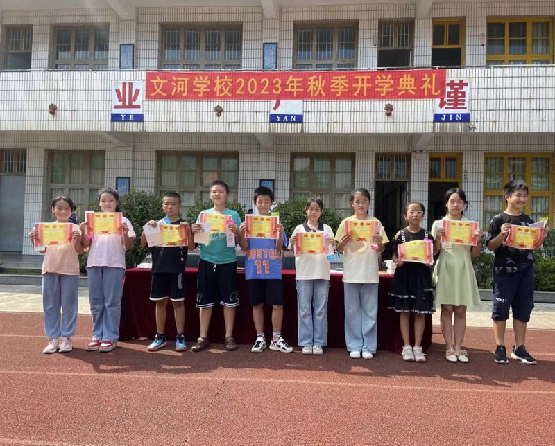 本网讯 9月7日,大福镇文河学校全体师生齐聚学校操场,举行2023年秋季学期开学典礼。 伴着雄壮的国歌声,五星红旗冉冉升起,全体师生肃立注目,仪式拉开了序幕。校长虎贲作了热情洋溢的新学期致辞,对刚入学的一年级新生表示欢迎,寄语大家学知识、讲文明,健康快乐成长。同时,也向全校师生提出了新学期的奋斗目标和发展方向,勉励大家要以良好心态、崭新面貌迎接新学期的学习生活。 教导主任刘丹对上学期表现优异的同学与班级进行了总结与表彰,一张张奖状无不承载着学生们的缤纷梦想。 政教主任李港重心长地对同学们讲到:生命只有一次,安全不能重来。并从校园安全、交通安全、活动安全、家庭安全、自我保护意识和能力等几方面对学生们进行安全教育,希望同学们珍爱生命,增强安全意识,让快乐和幸福伴随童年。 开学典礼的举行,标志着学校全体师生迈上了新的征程,不仅满载着美好的希望与憧憬,更为新学年的战斗吹响了进军的号角!